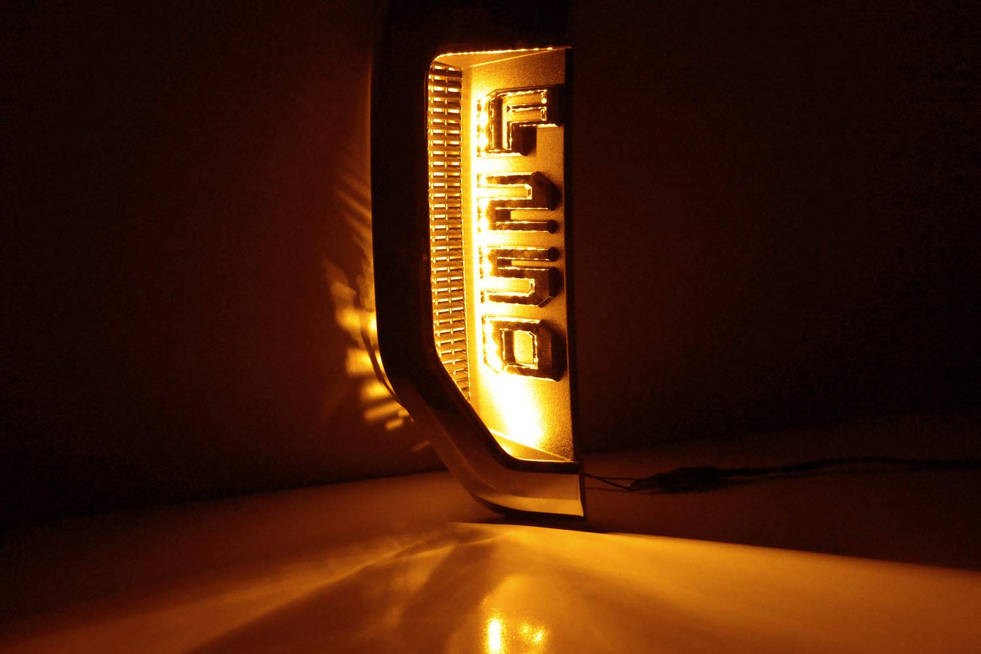 This page showcases a set of iJDMTOY Amber Yellow LED Background Illumination Kit Compatible with 2017-2021 Ford F250 F350 F450 Super Duty Side Fender Chrome Emblem.To learn more about the product, please see the detailed feature bullet points and pictures.