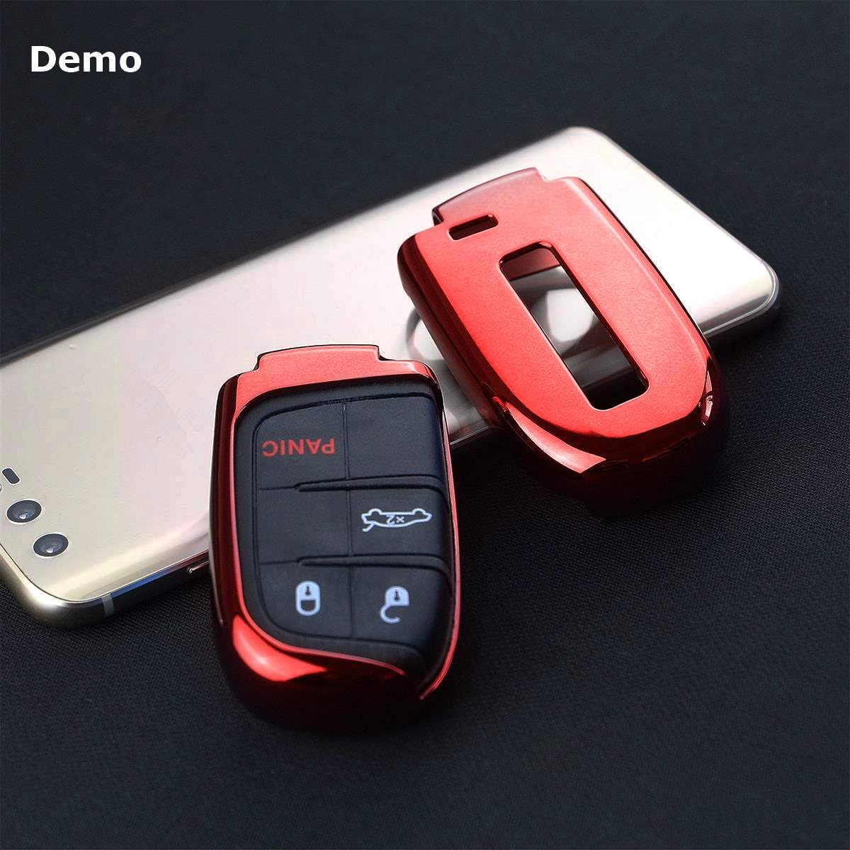 This page features a brand new set of iJDMTOY Chrome Finish Red TPU Key Fob Protective Cover Case Compatible With Charger Challenger Dart Durango Journey, Grand Cherokee, Renegade, 200 300, etc.