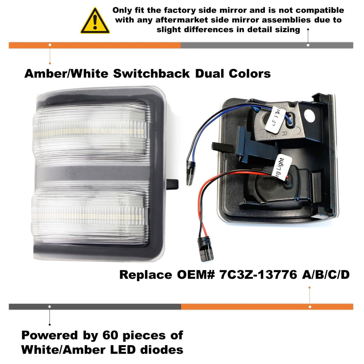 This page features a brand new set of iJDMTOY Clear Lens Switchback LED Side Mirror Marker Lamps Compatible With 2008-16 Ford F250 F350 F450 Super Duty, (2) Clear Lens, White LED Parking Light, Amber LED Turn Signal Light.For detail fitment information, please refer to product feature bullet point(s).