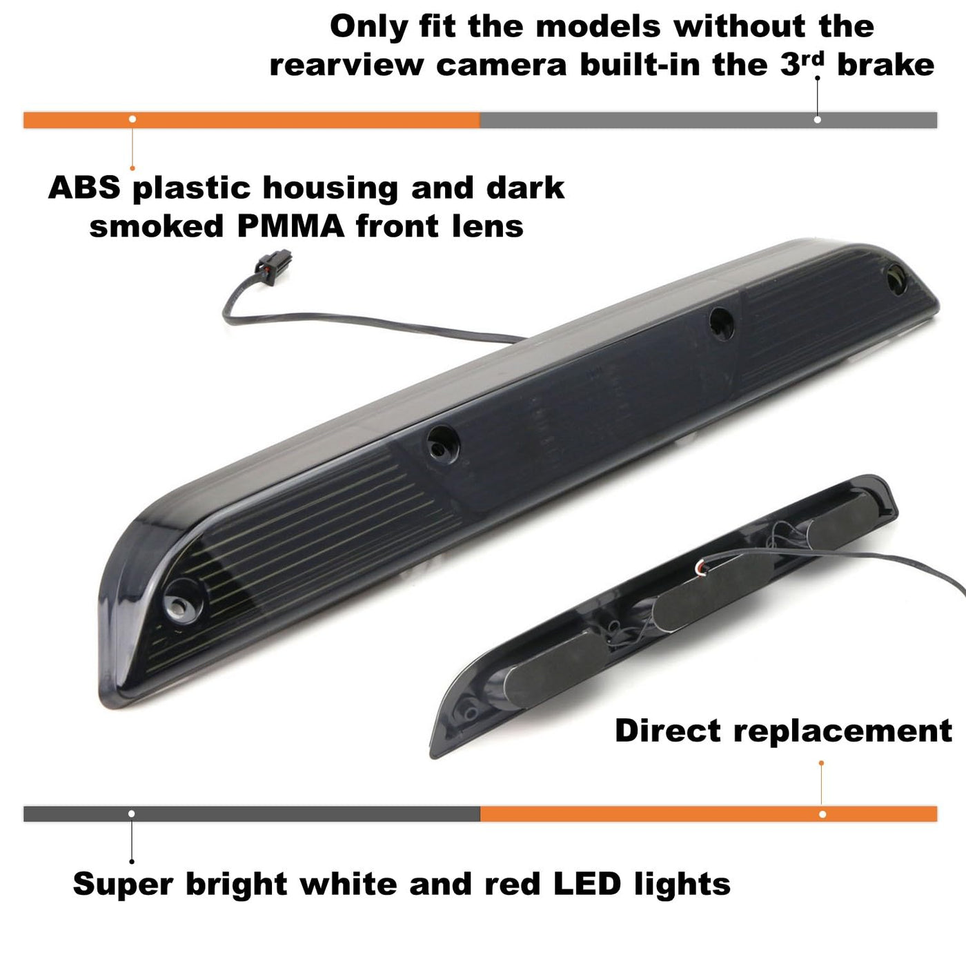 Q: What are the benefits of upgrading to this full LED high mount brake light?A: Upgrading to the iJDMTOY Full LED High Mount Brake Light enhances both safety and style. The full LED setup provides brighter illumination for the brake and reverse functions, improving visibility for other drivers. Additionally, the smoked lens gives your truck a modern and stylish look, setting it apart from standard brake lights.