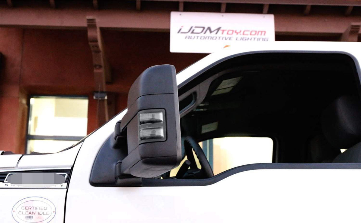 This Page Showcases A Set Of Ijdmtoy Smoked Lens Switchback Led Side Mirror Marker Lamps Compatible With 2008-16 Ford F250 F350 F450 Super Duty, (2) Smoked Lens, White Led Parking Light, Amber Led Turn Signal Light.