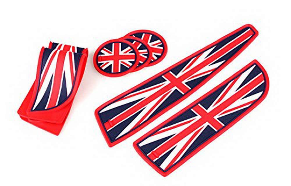 This Page Features A Brand New Set Of Ijdmtoy Union Jack Style Silicone Interior Cabin Mats Compatible With Mini Cooper R55 R56 R57 R58 R59, 7-Piece Red/Blue Cupholder Coasters, Side Door Compartment Liners.