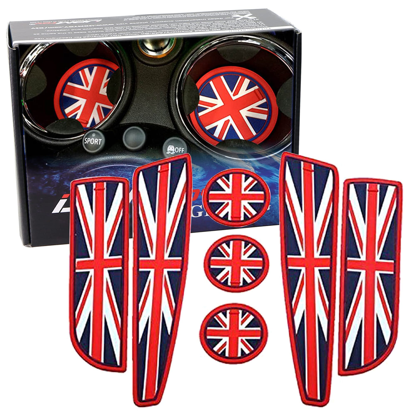 Ijdmtoy Union Jack Style Silicone Interior Cabin Mats Compatible With Mini Cooper R55 R56 R57 R58 R59, 7-Piece Red/Blue Cupholder Coasters, Side Door Compartment Liners