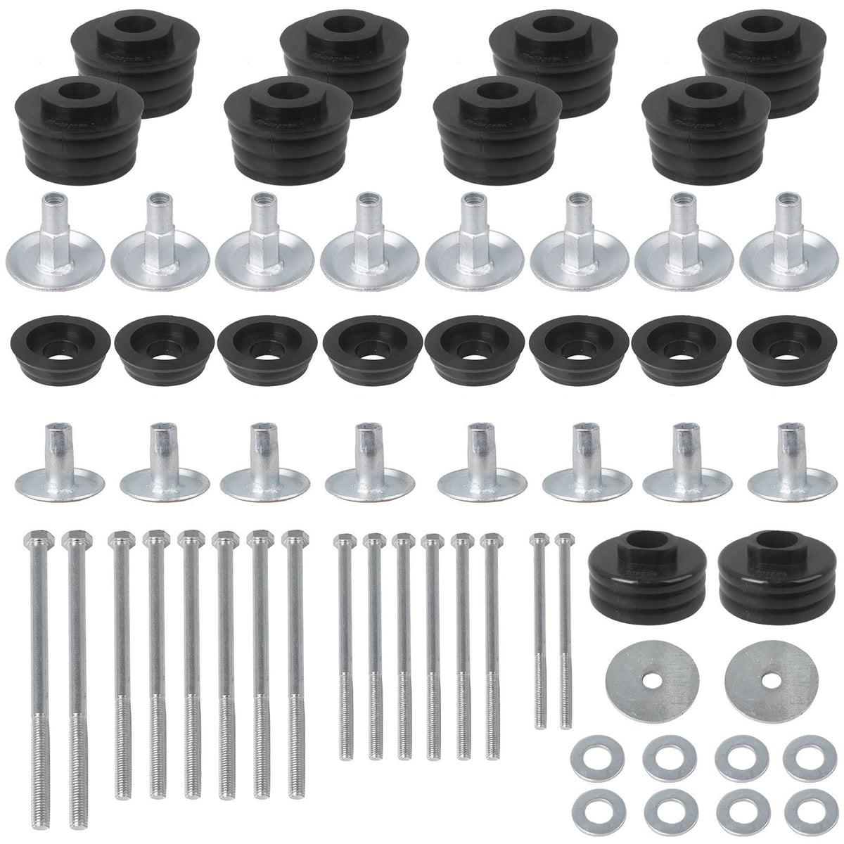 Q: How many pieces are included in the body mount kit?A: The kit includes a total of 36 pieces: 16 body mounts, 8 small steel mounts, 8 large steel mounts, 2 washers, and a complete hardware kit.