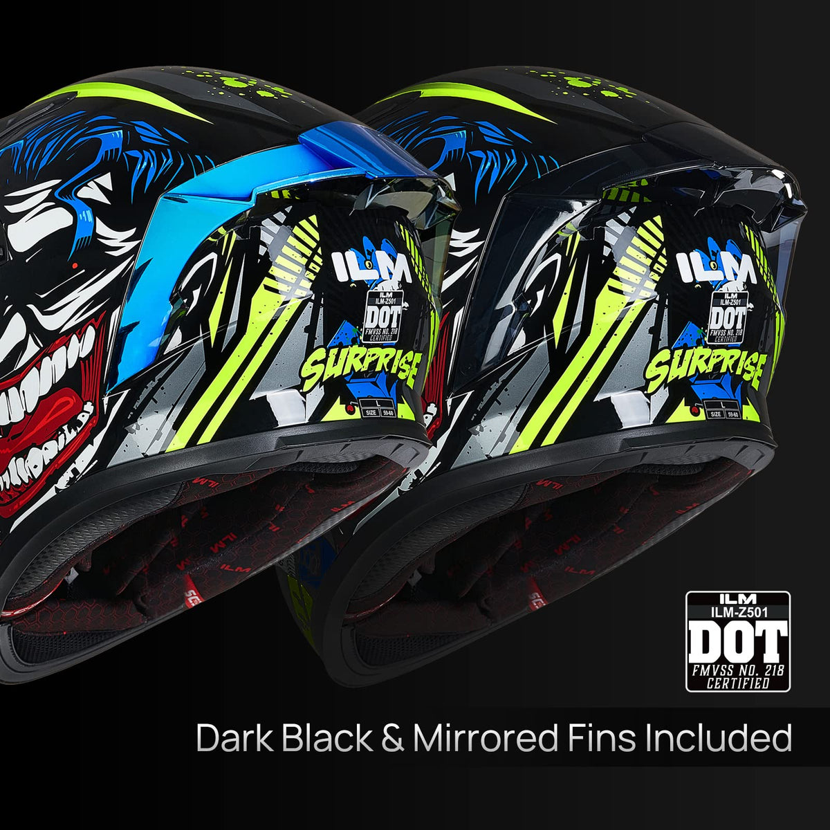 Q: What visors are included with the ILM Motorcycle Helmet?A: The helmet comes with two visors: a clear visor and a mirrored visor, both of which are designed to be compatible with the Pinlock anti-fog system for enhanced visibility.