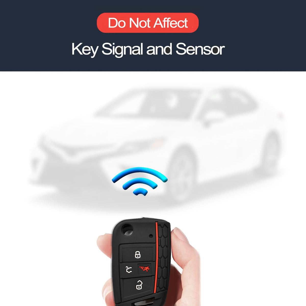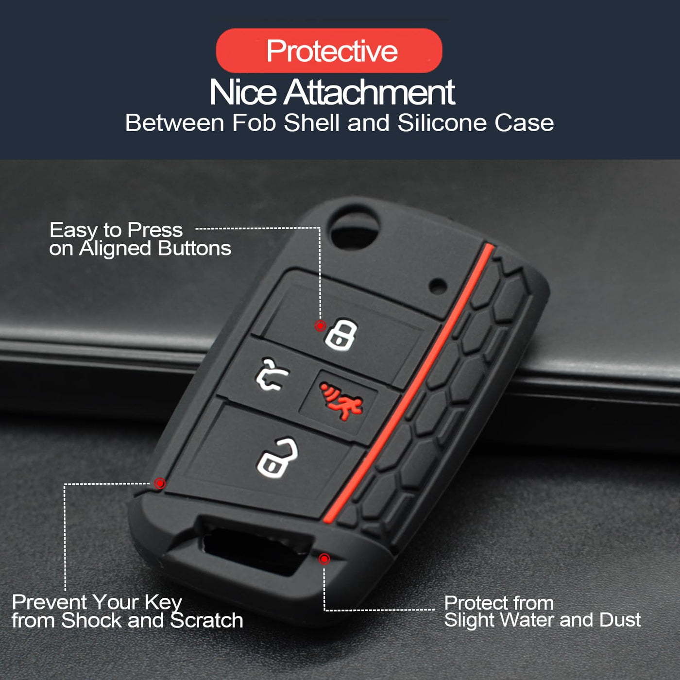 Protect an expensive component of your car purchase! This key fob protective shell covers your factory issued key fob to secure it against damage caused by life! If you drop it on the ground, the shock-absorbing silicone case takes the hit rather than your valuable key fob! And if you routinely toss your key into your purse or carry it in your pocket, the rubberized silicone will take the scratches; rather than your key fob! Another innovative benefit is that it adds Bonus: Nickel-plating Key Ring and Silicone Band to your key for safekeeping. Drop mould icons of the button will not fade easily. Not affecting signal and fob key sensor. Please note: the keyless remote is NOT included. Reference Part Number: NBGFS12A01 / 5G0959752BD / 5G0 959 752 BD Package Included: 2pcs silicone keyless key remote cases Bonus 2pcs key rings (Diameter: 0.984 inch, 1.181 inch) Bonus 1pcs silicone band w/ key ring It s a perfect deal for bargain-hunters! Press the Add to Cart button now and your keyless entry key fob will experience a great protection! Compatible With: 4 Buttons Flip Only, Not Fit GTI