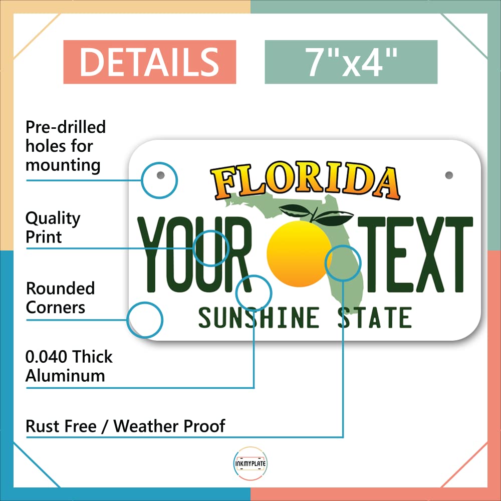 Inkmyplate Personalized Florida Small License Plate | Motorcycle 7X4 In | 3 Sizes | Custom License Plates For Kids Bicycles | Power Wheels | Wagons | Atv | Usa Thick .040 Aluminum