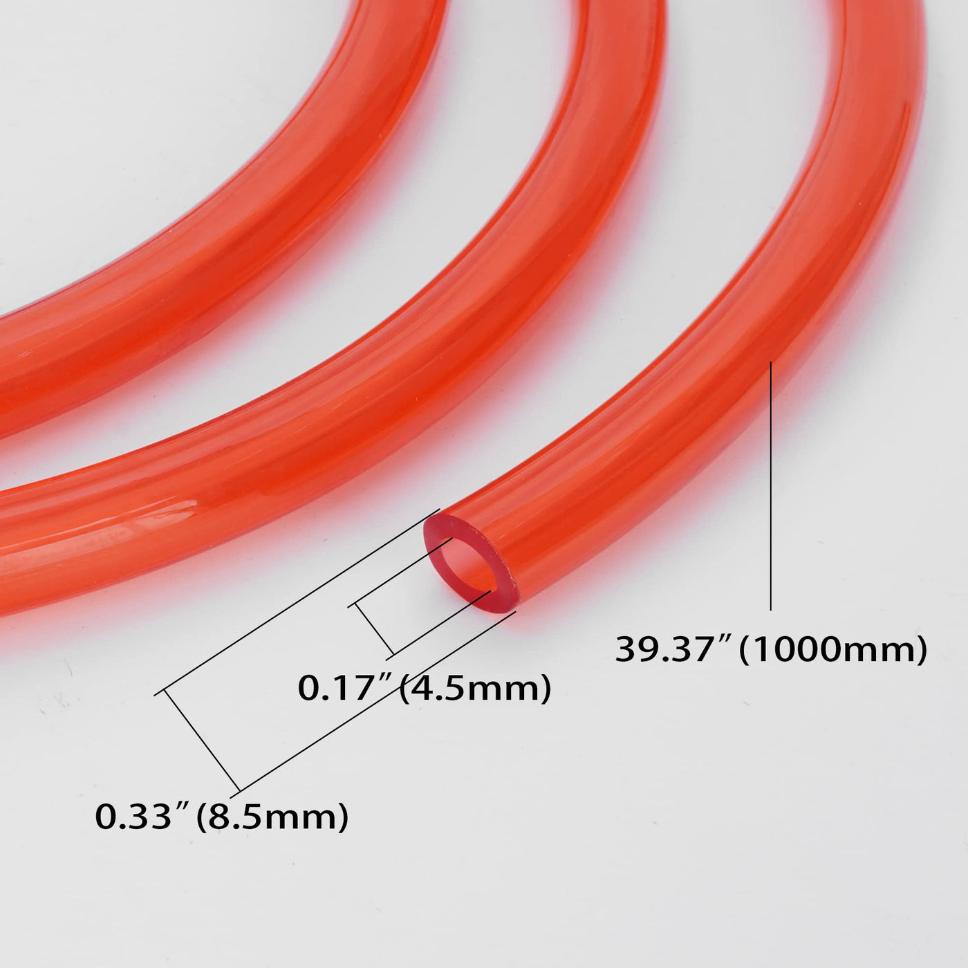Q: What are the dimensions and specifications of the fuel tubing?A: The hose tube has a total length of 39.37 inches (99cm-100cm), with an outer diameter of 0.33 inches (8.5mm) and an inner diameter of 0.17 inches (4.5mm), making it suitable for various applications.