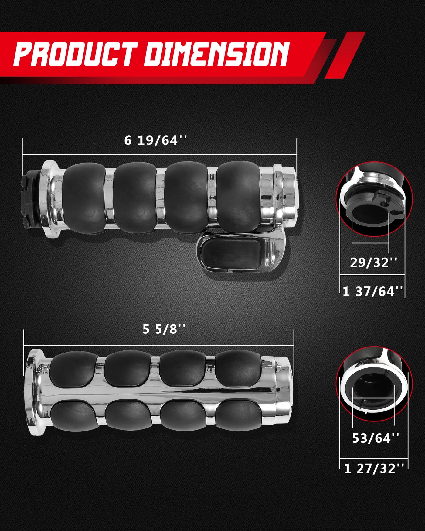 Fitment: Please check your handlebar size before you purchase To fit Suzuki and Kawasaki Harley with 1" handlebars(both left and right) (Not fit Harley Dyna 2006-2008,Harley 2007-2011, Harley Screaming Eagle 2008-2011,Harley Davidson Heritage Softail Classic 1999, Harley Davidson Sportster 1200XLH 1994,H-onda GL) Will not fit the 1-1/4" handlebar(on throttle side) Specification: 100% brand new Color: chrome and black Material: high quality aluminum & soft rubber Hole diameter: 1" Easy installation, directly replace your old hand grips Package Included: A pair of motorcycle hand grips