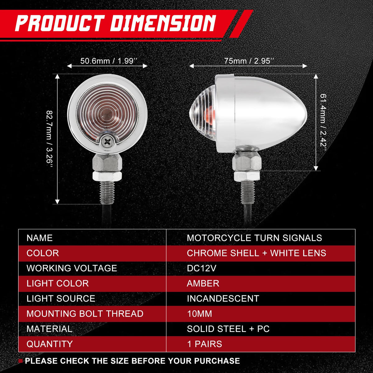 Fitment: Please check the size before you purchase Custom application,minor modification may be required for mounting Mini bullet shape,2-wire connection Make your motorcycle eye-catching in the street Super bright,faster on/off response for maximum safety Can be used as front/rear turn signals or daytime running lights Technical Specification: Color: chrome plated Solid metal surround with white lens Light Color: amber Working Voltage: DC 12V Size: approx 50mm(2")*62mm(2-7/16")*74mm(2-7/8") Mounting bolt thread: 10mm Wire length: approx 290mm/11.5inch Instructions: not included Package Included: A pair of bullet motorcycle turn signals