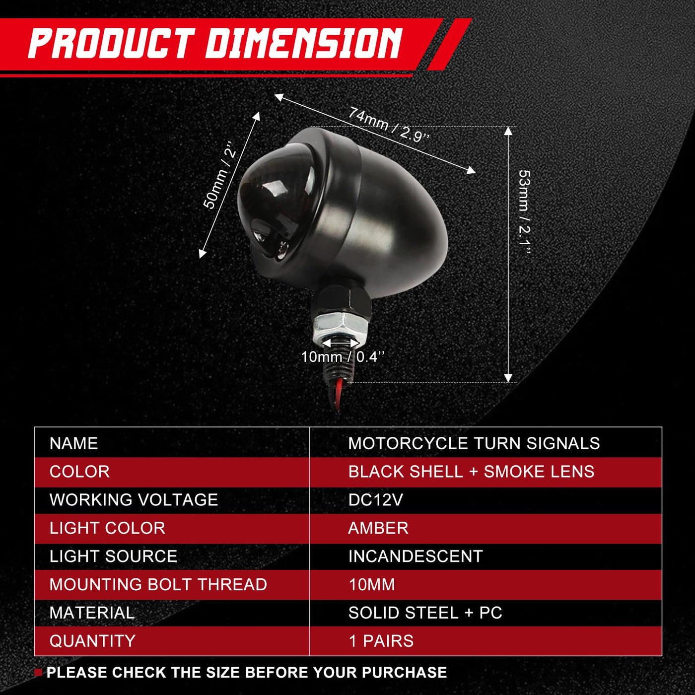 Fitment: Please check the size before you purchase Custom application, to fit most 10mm threaded motorcycle,,,,such asSuzuki/Kawasaki/Harley Davidson/Ducati/ BMW etc Minor drilling may be required for some models Stylish bullet shape, penetrating amber light Clearly show direction indication even in bad weather Technical Specifications: Working Voltage: DC 12V Light Color: amber Size: approx 50mm(2'')*83mm(3-1/4'')*74mm(2-7/8'') 10mm mounting bolt thread Instructions: not included Package Included: 1x Pair of bullet motorcycle turn signals