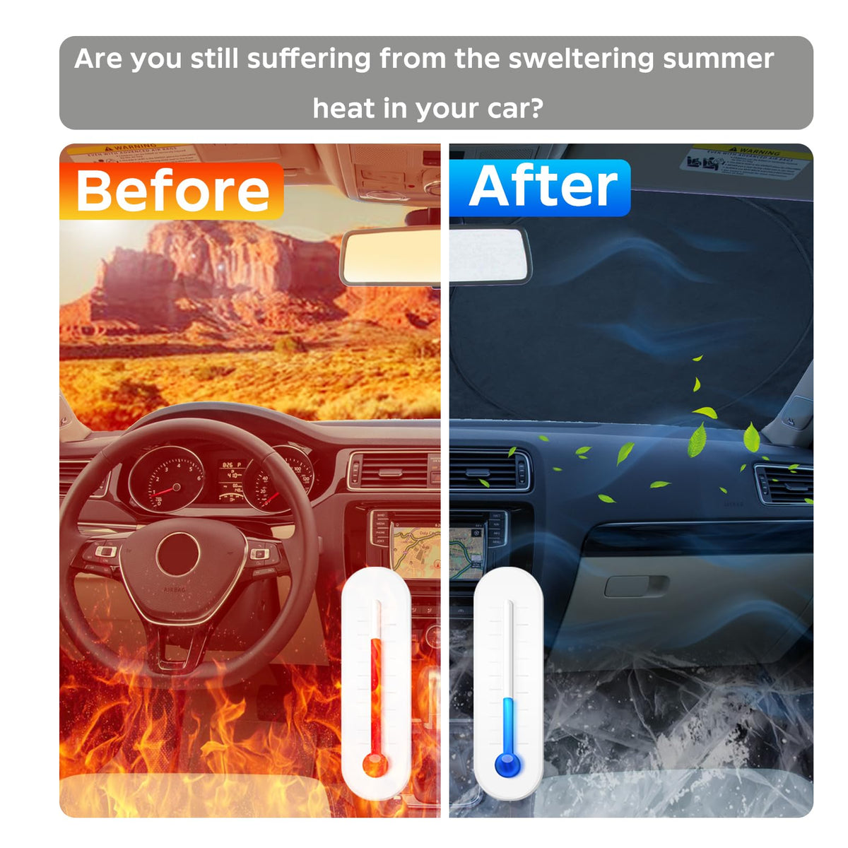 Looking for the perfect car shade to keep your car cool and comfortable during hot days? Front Windshield Sun Shade Foldable Sunshade Protector Custom Fit Accessories 2024 Upgrade Our front windshield sunshade is designed with a double layer of heat shield fabric providing efficient sun protection for your car. Say goodbye to scorching heat and harmful UV rays with this custom-fit solution designed specifically for your car. The benefits of using Sunshades are numerous and include long-term protection for your car's interior from harmful UV rays and heat, energy savings by reducing the workload on your car's air conditioning system, and a comfortable driving experience. With its custom design and effective sun-blocking properties, this front windshield sunshade is a practical and stylish addition to your car. Our product is easy to install and foldable, making it effortless to store and use. It only takes a few seconds to install and remove and comes with a high-quality bag for storage. Portable enough to carry with you wherever you go in your car, it's an excellent accessory. When not in use, conveniently fold and store it in your car's storage compartment or trunk. Front Windshield Sunshade is a custom product with double reflective and thermal insulation layers that can block the sunlight and harmful UV rays, shielding your car from heat, and preventing its interior from fading and cracking. Crafted from high-quality, reflective material, this sunshade efficiently blocks out the sun's rays, preventing heat buildup and UV damage to your vehicle's interior. Don't let the sun's harsh rays damage your car's interior - invest in the Windshield Sunshade today and enjoy a cooler, more comfortable driving experience. Order now and enjoy the benefits of staying cool and comfortable for the years to come.