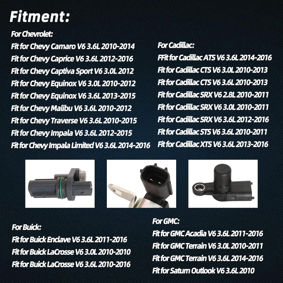 Fitment: Fit for Buick Enclave V6 3.6L 2011-2016 Fit for Buick LaCrosse V6 3.0L 2010-2010 Fit for Buick LaCrosse V6 3.6L 2010-2016 Fit for Cadillac ATS V6 3.6L 2014-2016 Fit for Cadillac CTS V6 3.0L 2010-2013 Fit for Cadillac CTS V6 3.6L 2010-2013 Fit for Cadillac SRX V6 2.8L 2010-2011 Fit for Cadillac SRX V6 3.0L 2010-2011 Fit for Cadillac SRX V6 3.6L 2012-2016 Fit for Cadillac STS V6 3.6L 2010-2011 Fit for Cadillac XTS V6 3.6L 2013-2016 Fit for Chevrolet Camaro V6 3.6L 2010-2014 Fit for Chevy Caprice V6 3.6L 2012-2016 Fit for Chevy Captiva Sport V6 3.0L 2012 Fit for Chevy Equinox V6 3.0L 2010-2012 Fit for Chevy Equinox V6 3.6L 2013-2015 Fit for Chevy Impala V6 3.6L 2012-2015 Fit for Chevy Impala Limited V6 3.6L 2014-2016 Fit for Chevy Malibu V6 3.6L 2010-2012 Fit for Chevy Traverse V6 3.6L 2010-2015 Fit for GMC Acadia V6 3.6L 2011-2016 Fit for GMC Terrain V6 3.0L 2010-2011 Fit for GMC Terrain V6 3.6L 2014-2016 Fit for Saturn Outlook V6 3.6L 2010 OE Part Number: Intake & Exhaust Solenoid: 12586722, 12588943, 12615613, 12626012, 12636175, TS1013 Cam Camshaft Position Sensor: 12684186, 12615371, 2134592, 2351899 Engine Crankshaft Position Sensor: 12615626, 213-4573, 5S12643, J5T33671, 1238249 Package Inculding: 4* Engine Variable Valve Timing (VVT) Solenoid 1* Cam Camshaft Position Sensor 1* Crankshaft Position Sensor