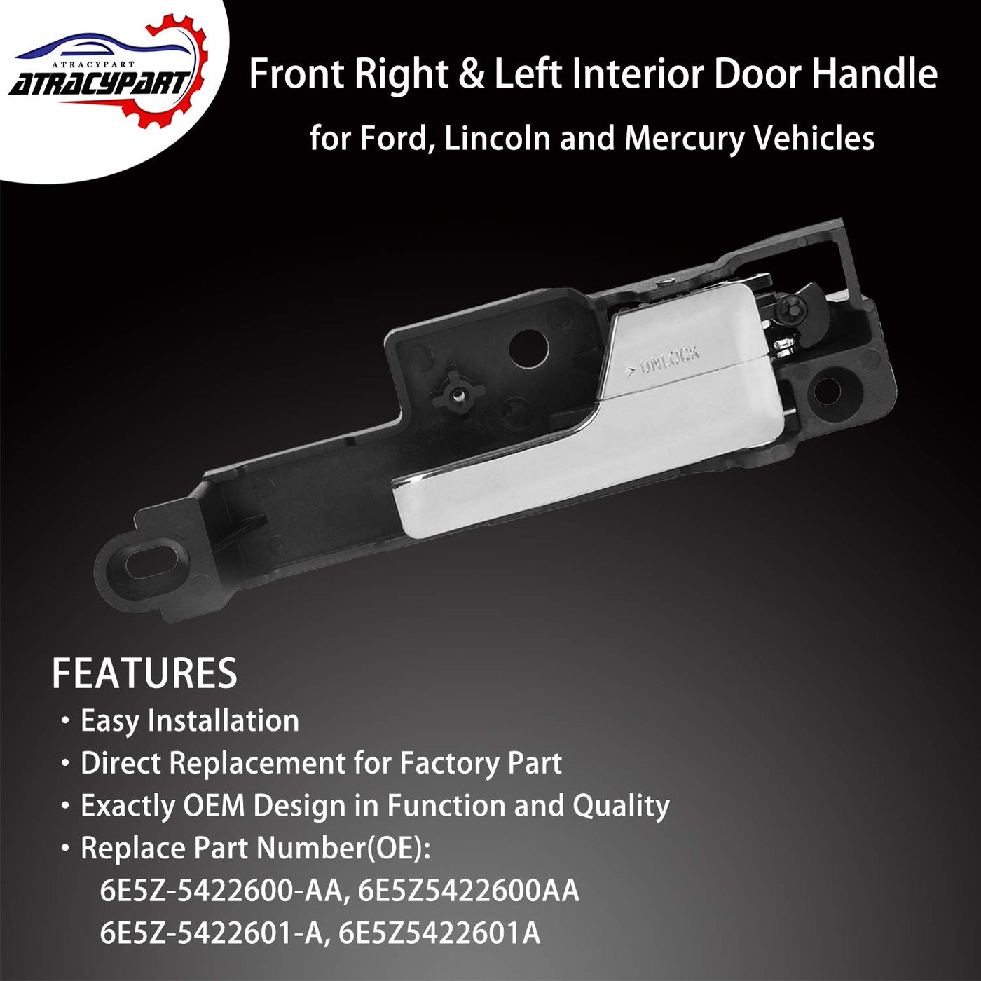 Q: What are the replacement part numbers for this product?A: The replacement part numbers for this interior door handle are 6E5Z-5422600-AA, 6E5Z5422600AA, 6E5Z-5422601-A, and 6E5Z5422601A.