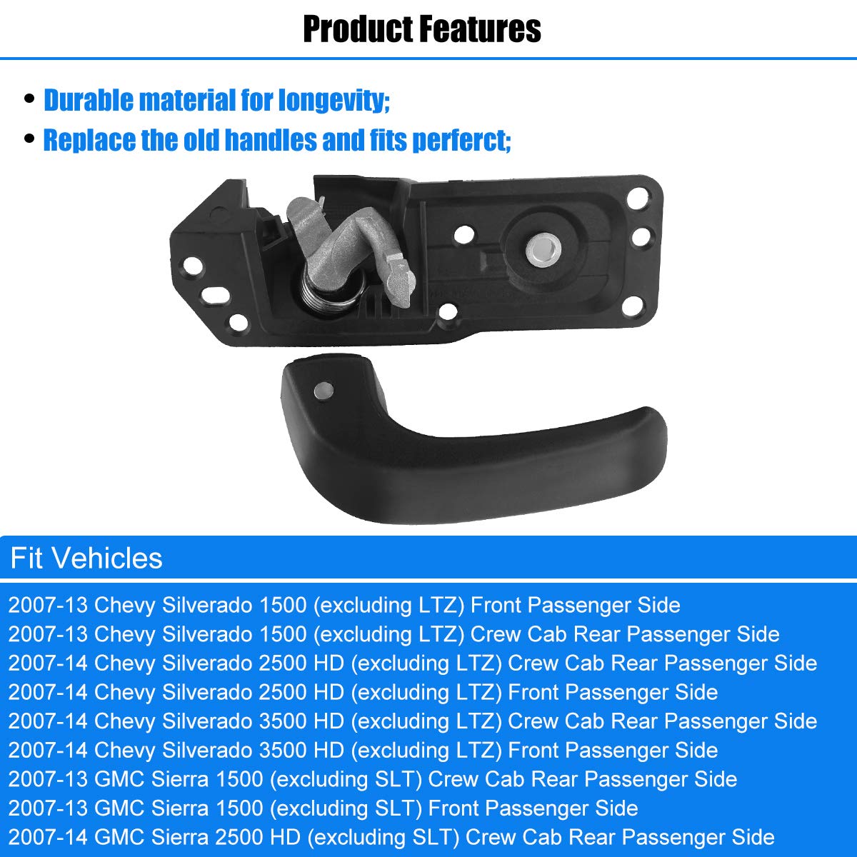 Q: What vehicles are compatible with this interior door handle replacement?A: This interior passenger door handle replacement is compatible with various models including the 2007-2014 Chevy Silverado 1500, 2500, and 3500, GMC Sierra, Cadillac Escalade, Avalanche, Suburban, and Yukon. It fits both front and rear passenger sides.