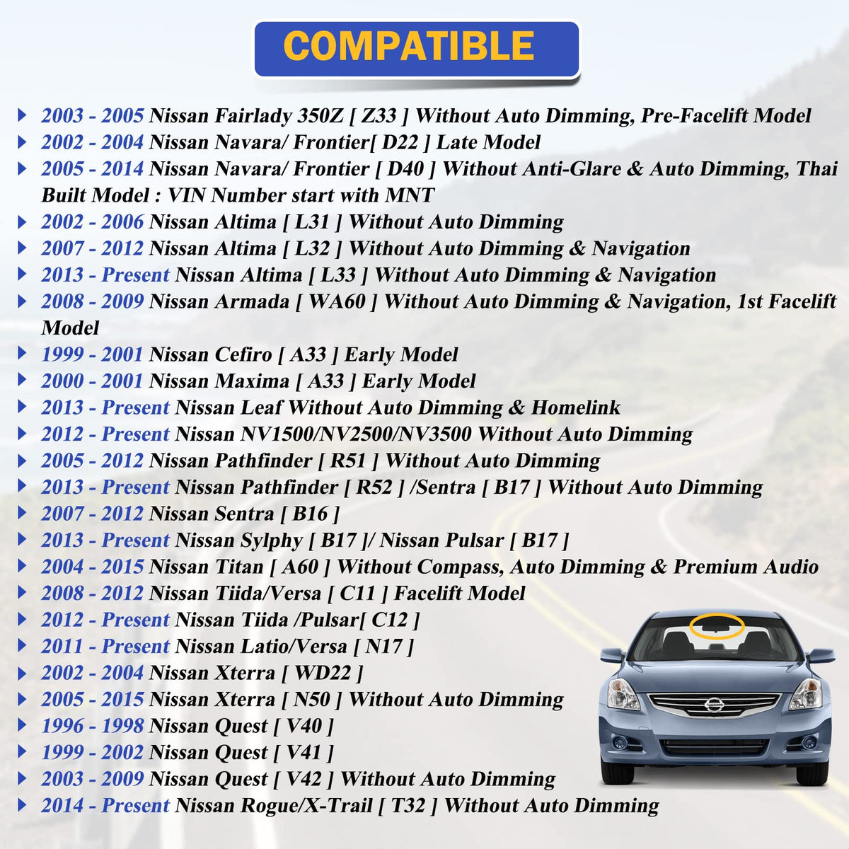 Manufacturer Part Number: 96321-2DR0A Feature: The parts are manufactured in strict accordance with OEM specifications, stable characteristics, high reliability. Perfect match for the original car. Warranty: 12 month Package Included: Interior Rear View Mirror Assembly x 1 Fit for the following vehicles: 2003-2005 Nissan Fairlady 350Z [ Z33 ] Without Auto Dimming, Pre-Facelift Model 2002-2004 Nissan Navara/ Frontier[ D22 ] Late Model 2005-2014 Nissan Navara/ Frontier [ D40 ] Without Anti-Glare & Auto Dimming, Thai Built Model : VIN Number start with MNT 2002-2006 Nissan Altima [ L31 ] Without Auto Dimming 2007-2012 Nissan Altima [ L32 ] Without Auto Dimming & Navigation 2013-Present Nissan Altima [ L33 ] Without Auto Dimming & Navigation 2008-2009 Nissan Armada [ WA60 ] Without Auto Dimming & Navigation, 1st Facelift Model 1999-2001 Nissan Cefiro [ A33 ] Early Model 2000-2001 Nissan Maxima [ A33 ] Early Model 2013-Present Nissan Leaf Without Auto Dimming & Homelink 2012-Present Nissan NV1500/NV2500/NV3500 Without Auto Dimming 2005-2012 Nissan Pathfinder [ R51 ] Without Auto Dimming 2013-Present Nissan Pathfinder [ R52 ] /Sentra [ B17 ] Without Auto Dimming 2007-2012 Nissan Sentra [ B16 ] 2013-Present Nissan Sylphy [ B17 ]/ Nissan Pulsar [ B17 ] 2004-2015 Nissan Titan [ A60 ] Without Compass, Auto Dimming & Premium Audio 2008-2012 Nissan Tiida/Versa [ C11 ] Facelift Model 2012-Present Nissan Tiida /Pulsar[ C12 ] 2011-Present Nissan Latio/Versa [ N17 ] 2002-2004 Nissan Xterra [ WD22 ] 2005-2015 Nissan Xterra [ N50 ] Without Auto Dimming 1996-1998 Nissan Quest [ V40 ] 1999-2002 Nissan Quest [ V41 ] 2003-2009 Nissan Quest [ V42 ] Without Auto Dimming 2014-Present Nissan Rogue/X-Trail [ T32 ] Without Auto Dimming