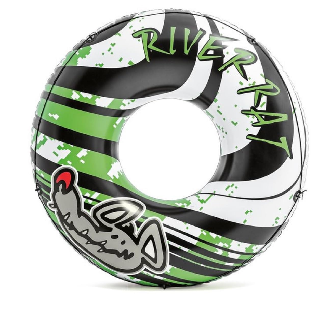 Product DescriptionEnjoy floating around on our highly popular River Rat inflatable swim tube. It's ideal for floating, swimming or playing with at the pool, beach, lake or river. Designed with bold stripes and a fun cartoon rat picture, this tube lives up to its name. Sturdy and durable, the tube is constructed with two air chambers with double valves, and an all-around grab line for easy handling.From the ManufacturerEnjoy floating around on an Intex River Rat. This swim tube is ideal for floating, swimming or playing with at the pool, beach, lake or river. Designed with bold stripes and a fun cartoon rat picture, this tube lives up to its name. Sturdy and durable, the tube is constructed with two air chambers with double valves, and an all-around grab line for easy handling. A repair patch is included. Age grade: 9+ years. Dimensions: 48 diameter. Includes: All-around grab line. Repair patch.