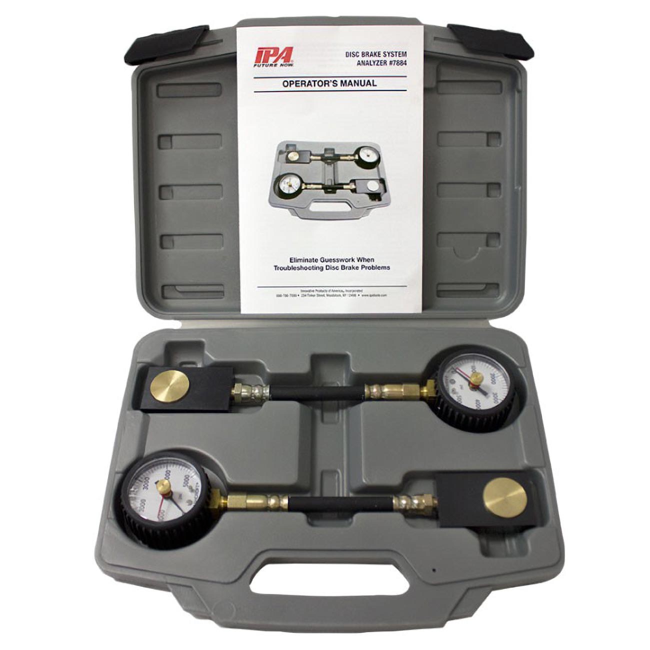 Q: What is the purpose of the Innovative Products Of America 7884 Disc Brake System Analyzer?A: The Innovative Products Of America 7884 Disc Brake System Analyzer is designed to eliminate guesswork when troubleshooting disc brake problems. It enables effective brake testing with its red tell-tale memory needle, making it ideal for one-man operations.