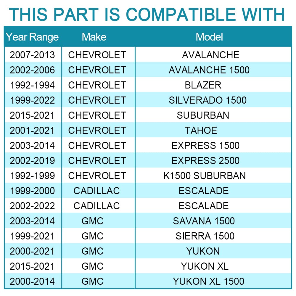 Q: What vehicles are compatible with the IRONTEK 1.5'' wheel spacers?A: The IRONTEK 1.5'' wheel spacers are compatible with a range of vehicles including the 1999-2019 Chevrolet Silverado 1500, 2001-2019 Chevrolet Tahoe, 2007-2013 Chevrolet Avalanche, 2000-2015 Chevrolet Suburban 1500, and 1999-2019 Cadillac Escalade. It is recommended to check your vehicle's Year/Make/Model with the PART FINDER TOOL before purchasing.