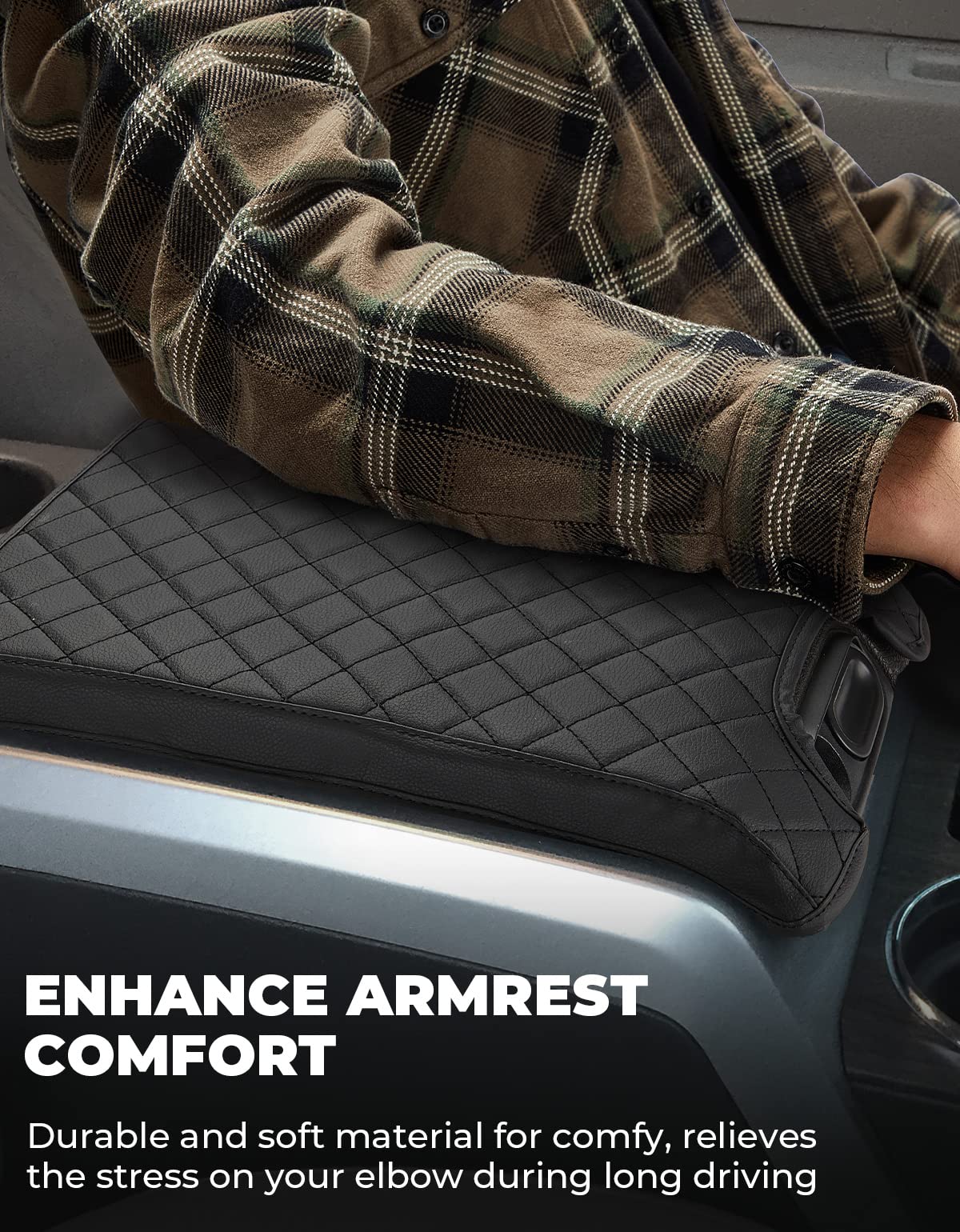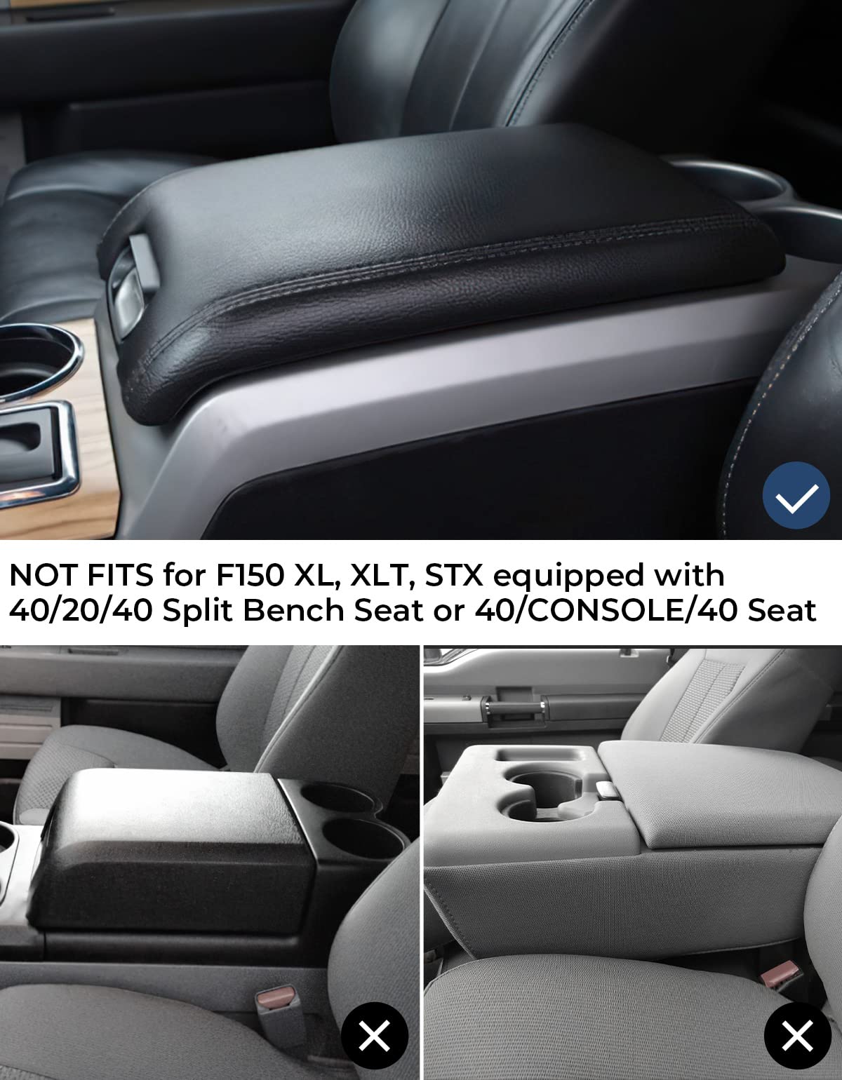 ?CUSTOMIZED FIT?Center console lid compatible with 2009 2010 2011 2012 2013 2014 F150. With Latch Opening that allows easy open the console. Undergo compatibility test to ensure perfect fit. ?ENHANCE ARMREST COMFY?Made of quality leather and filled with sponge, extra enhance the armrest comfy, relieves the stress of your elbow while driving, and keeps your arm from burning in the hot summer or keeping a sweaty arm from slipping around. ?EASY TO INSTALL?The armrest cover is put on and taken off in seconds, without any tool. It is durable and rugged enough that not damaged when installed. ?STABLE, NO-SLIDE?Customized size for a pretty tight fit, will not be loose or slide back and forth. And the elastic bands in the back make sure the armrest is securely in place, and will not slide even if your pet stands in it. ?FULL PROTECTION?Wide enough to cover the entire top and side of the console to provide full protection. Anti-scratch, effectively avoids fingernails, dog paws, or key scratches, avoids pet footprints/saliva, sweat arm, and dirt soil the armrest.