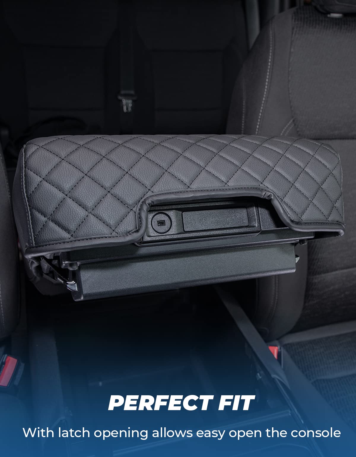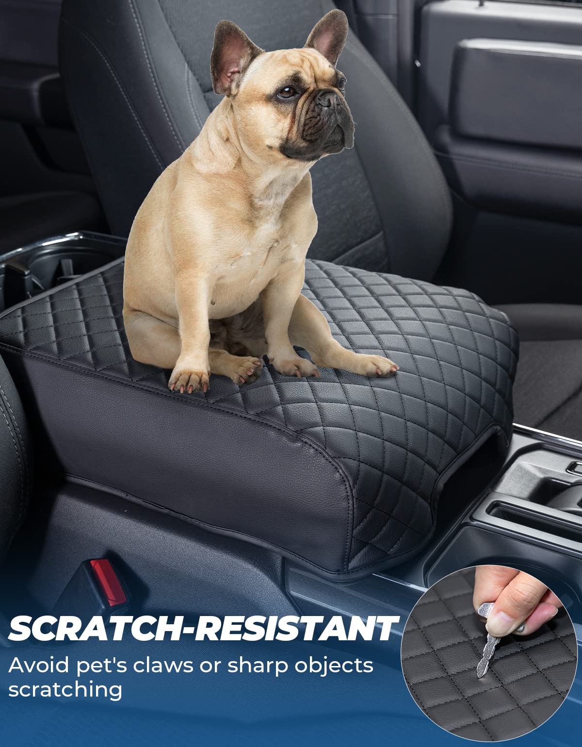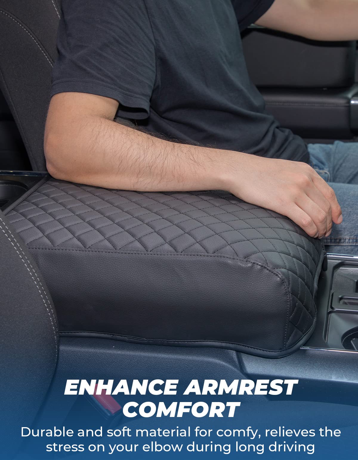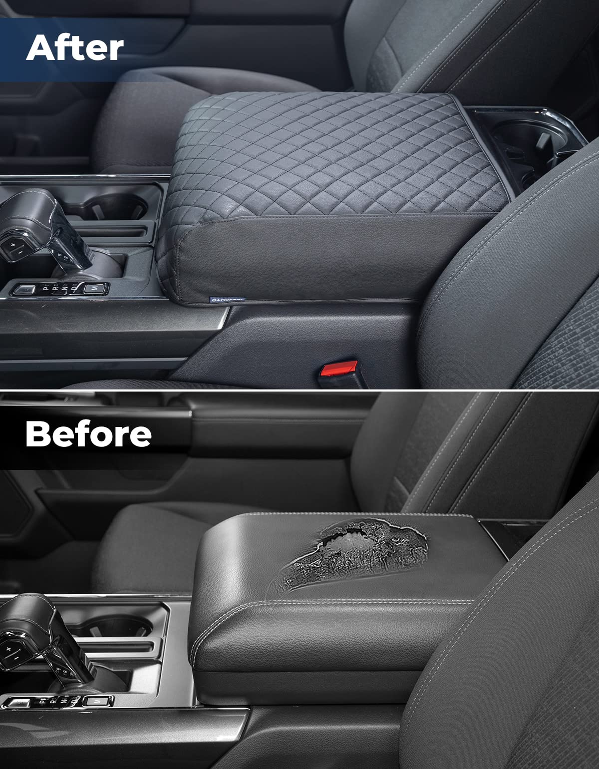 ?CUSTOMIZED FIT?Center console cover compatible with 2021 2022 2023 2024 F150, NOT fit for jumpseat console. With Latch Opening that allows easy open the console. Undergo compatibility tests to ensure the perfect fit. ?COMFY ON THE SKIN?Made of quality soft leather, and filled with sponge. Extra enhance the armrest comfy, relieves the stress of your elbow while driving, and keeps your arm from burning in the hot summer or keeping a sweaty arm from slipping around. ?EASY TO INSTALL?Armrest cover is easy to put on and take off in seconds, without any tool. It is durable and rugged enough that not damaged when installed. ?STABLE, NO-SLIDE?Customized size for a pretty tight fit, will not be loose or slide back and forth. And 2 elastic bands in the back to make sure the armrest is securely in place, and will not slide even if your pet stands on it. ?FULL PROTECTION?Wide enough to cover the entire top and side of the console to provide full protection. Anti-scratch, effectively avoids dog paws, fingernails, or key scratches, avoid pet footprints/saliva, sweat arm, and dirt soil the armrest.