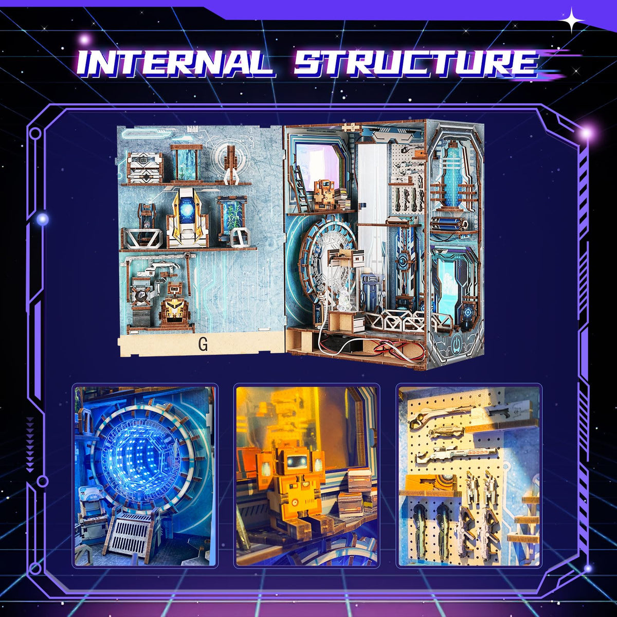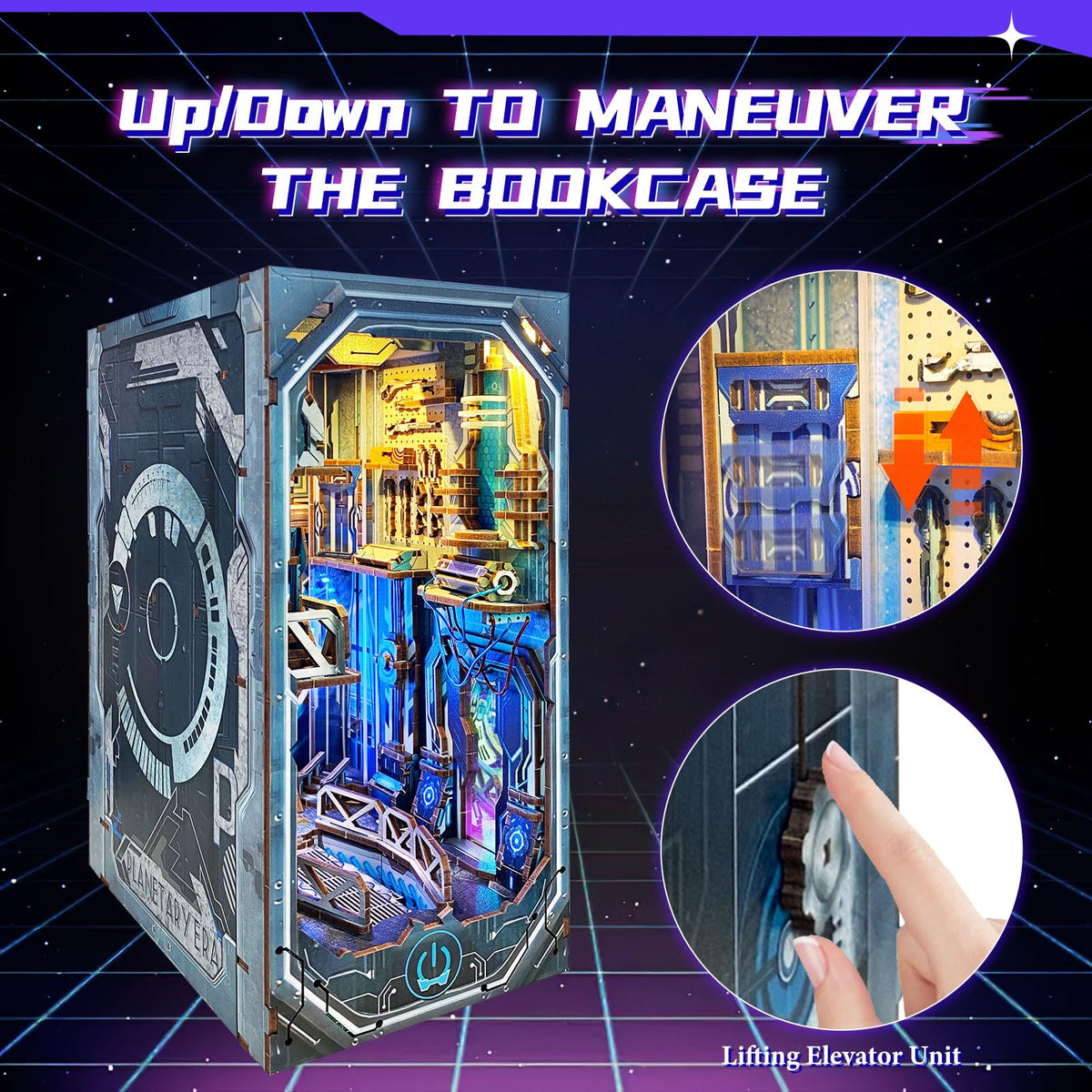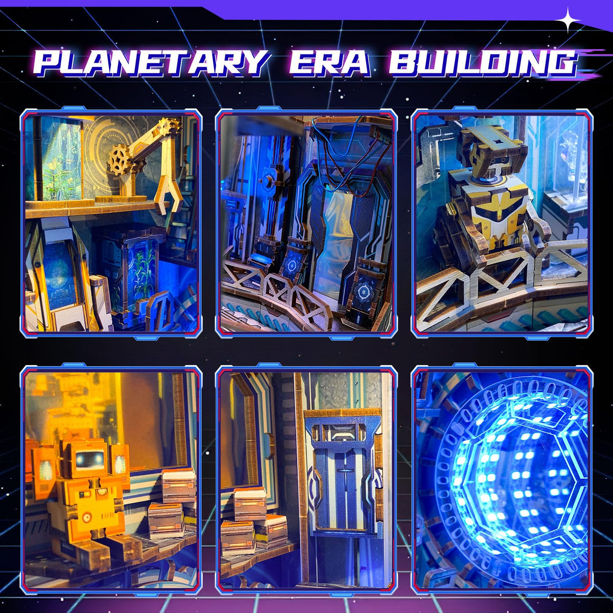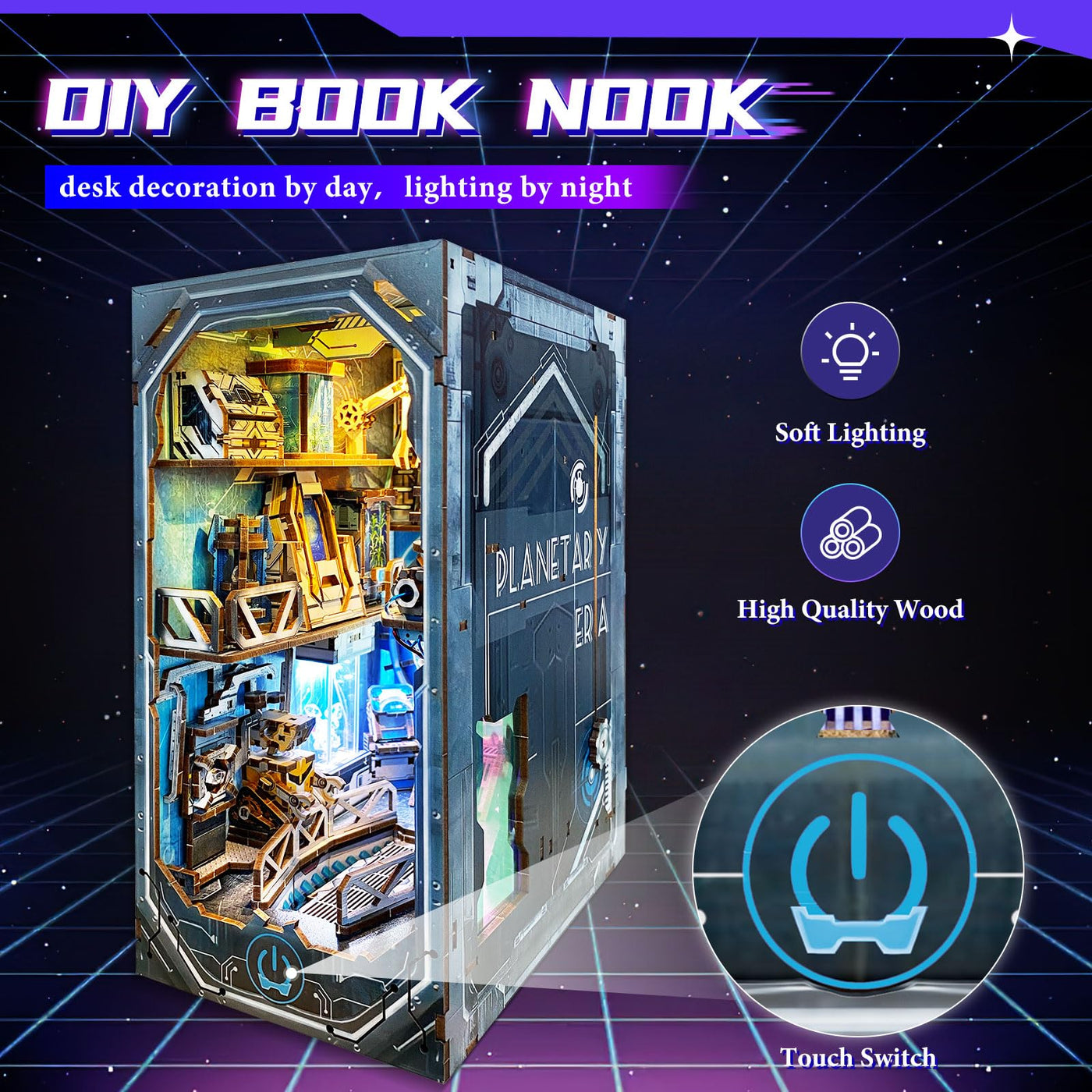 PLANETARY ERA BOOK NOOK DOLLHOUSE KIT: Our PLANETARY ERA book nook dollhouse kit contains realistic miniature furniture, with a highly reproducible attic top and bottom design, showcasing the interior's rich modelling design and sky-high spatial structure through the corner staircase and skeleton fence. It is assembled from small parts, which helps to develop logical thinking skills and exercise hands-on skills in the process.