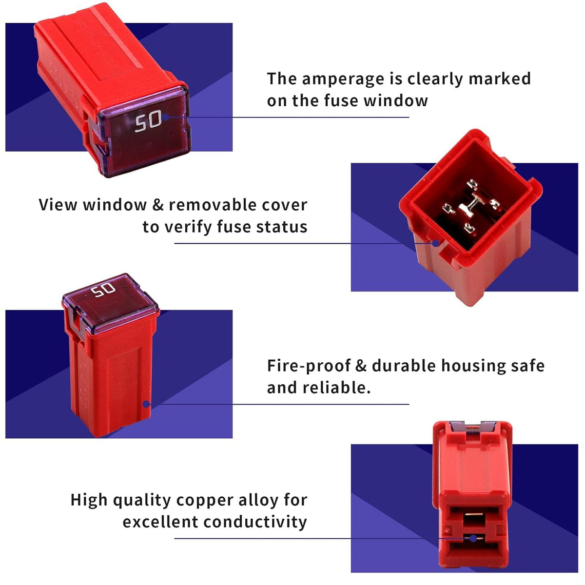High quality! 100% Brand new! - Mmonly used replacement fuses for most vehicles. - Much cheaper than buying them at your local automotive store. - Nice to have lots of spare fuses if you have lots of equipment. - Perfect for any mechanic or repair shop. - If you've ever blown an auto fuse before & had to run to the hardware store for a single fuse, you know how much of a time saver this will be. ? Can be used for: Car,SUV,Truck,Motorcycle,Home,Boat,Camper RV,ATV Quad,UTV,Golf Car - Most electrical devices. ? Value list: - High Profile: 50A - 10pcs ?Tips: Make sure the picture fuse size is suitable for your car About returns policy and our services: 1.If you are not satisfied with our product or order wrong item, let us know at the first time, we will reply you in 12 hours. 2.If you are satisfied with our products, please don't forget to leave 5 stars Positive Feedback, we will appreciate your encourage.