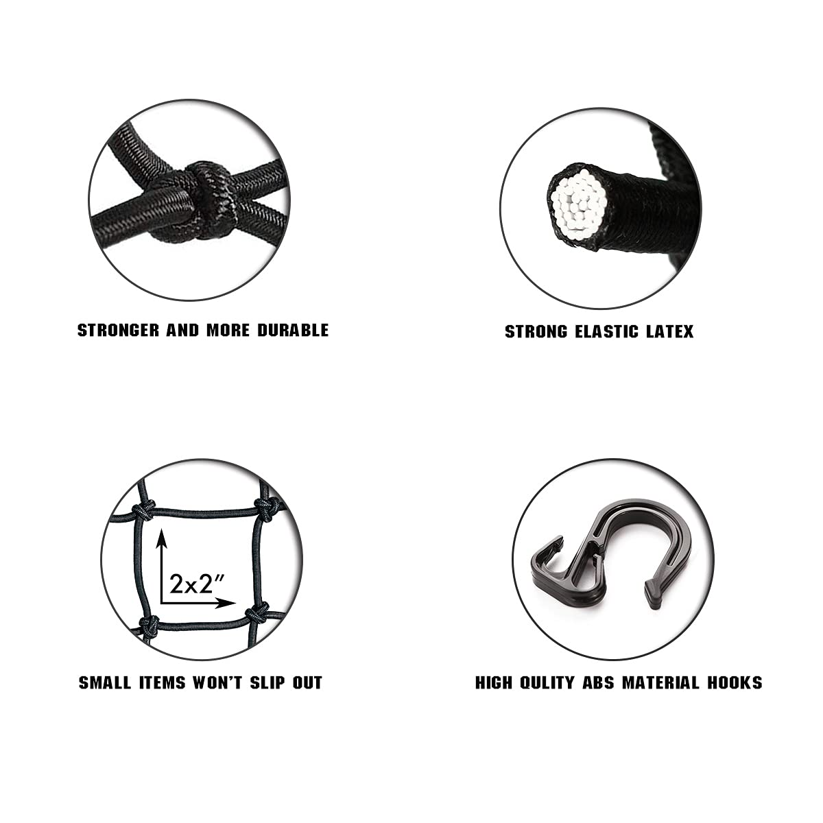 Product details: Material: Latex bungee, ABS plastic hooks Size: 15''x15'', can be streched to 30''x30'' Mesh: Small 2''x2'' latex Bungee diameter: 5mm hooks: 6PCS ABS Hook PVC storage bag Color: Black Includes: 15''x15'' Bungee Net 12 ABS HOOKS Storage Bag