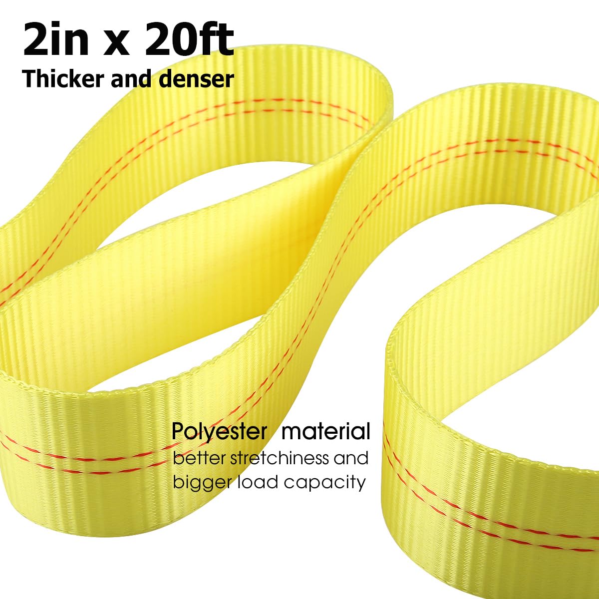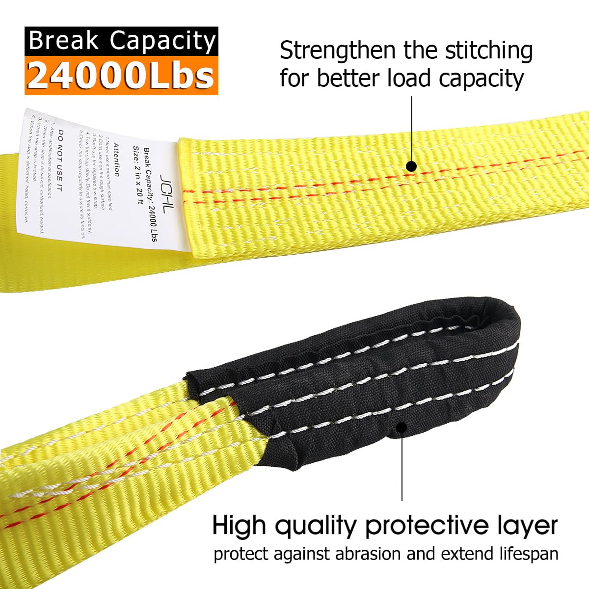 tow the rope slowly, do not tow it suddenly Specifications: Color: Bright yellow Material: Made of high tensile strength nylon Width: 2 Inch Length: 20 Feet Break Strength Capacity: 24,000lbs Weather resistance and durable perfect length, perfect for tow and recovery car. Package include: 1* towing strap in Storage Bag