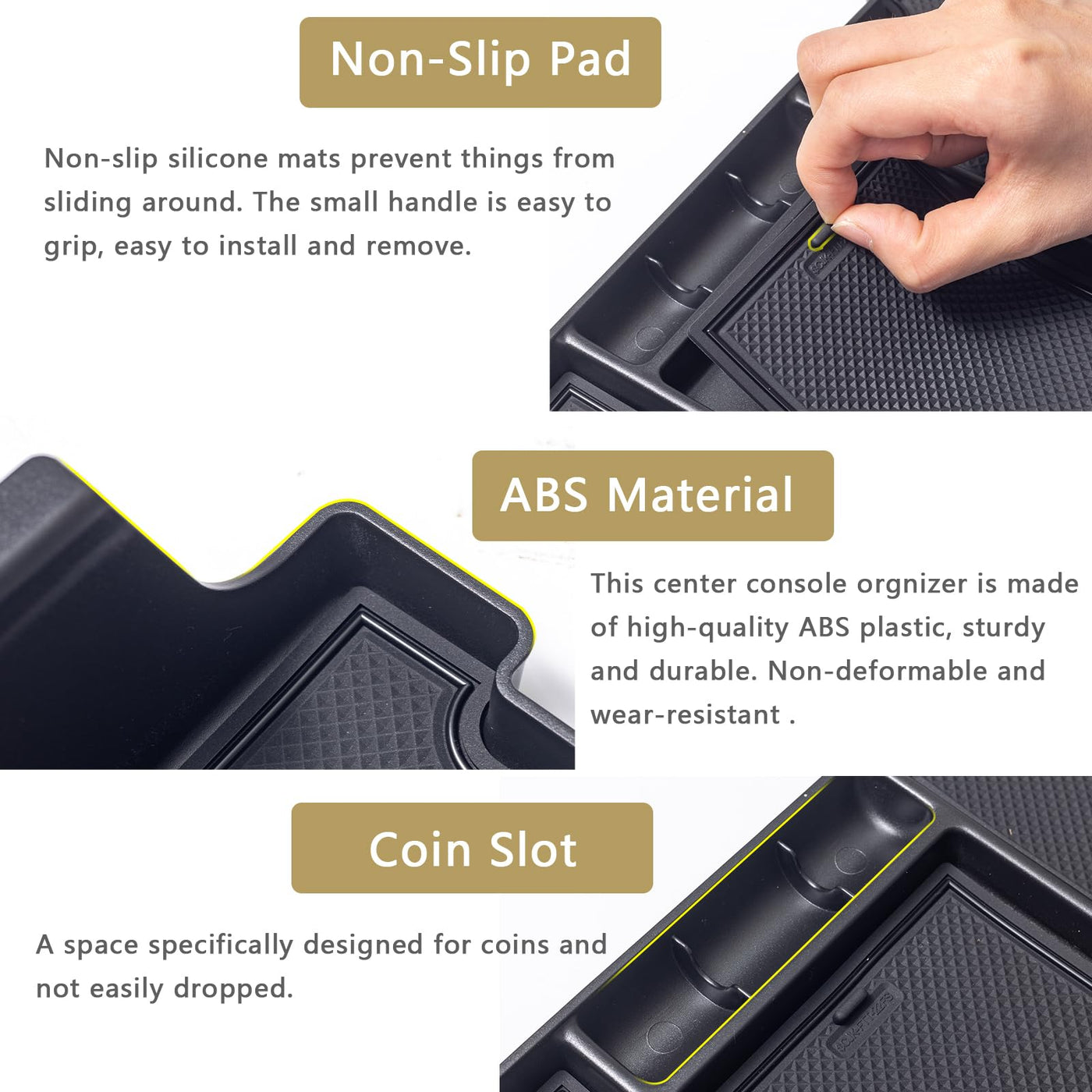Q: What materials are used in the construction of the JDMCAR Center Console Organizer?A: The organizer is made from high-quality ABS plastic with a matte finish, making it durable enough to withstand the impact of driving while also featuring removable rubber liners for added friction and noise reduction.