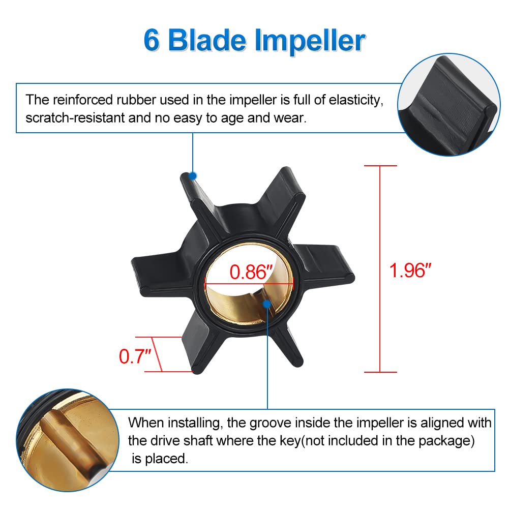 Replaecment for the following Vehicles Replaecment for Mercury 2-Stroke Outboards Replaecment for Mercury outboard 35 hp (6445653 & Up)2 cyl 1984-1989 Replaecment for Mercury outboard 40 hp (4860103-5556229)2 cyl 1978-1979 Replaecment for Mercury outboard 40 hp (5556230-6445653)2 cyl 1980-1983 Replaecment for Mercury outboard 40 hp (0C159200 & Up)4cyl 1989-Up Replaecment for Mercury outboard 45 hp (5531630 & Up)4 cyl 1986-Up Replaecment for Mercury outboard 50 hp (4962056 & Up)4 cyl 1978-1985 Replaecment for Mercury outboard 50 hp (6428681-0D000749)3 cyl 1984-1990 Replaecment for Mercury outboard 60 hp (6428681-0D000749)3 cyl 1984-1990 Replaecment for Mercury outboard 65 hp (4382057-4571651)3 cyl 1976 Replaecment for Mercury outboard 70 hp (4977157-6428680)3 cyl 1979-1983 NOTE:To maintain best engine perormance and to prolong engine life, it is recommended to service the water pump every 1-2 years. Why Choose JDMON Outboard Water Pump Impeller Kit? 1. Easy installation and direct replacement. 2. Stable characteristics and high reliability. 3. A good replacement for the damaged or old pump kit. 4. Strictly install OE standard manufacturing, meet OE standard. 5. The material is upgraded, the elasticity and toughness are greatly improved, and it is not easy to be aging and wear, and it is durable.