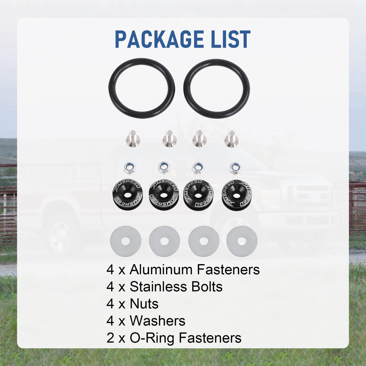 Q: How do I install the JDMSPEED quick release fasteners?A: Installation of the JDMSPEED quick release fasteners is straightforward. Simply replace your existing bumper bolts with the included aluminum fasteners, secure them with the stainless bolts and nuts, and you’re ready to go. No tools are needed for bumper removal once installed.