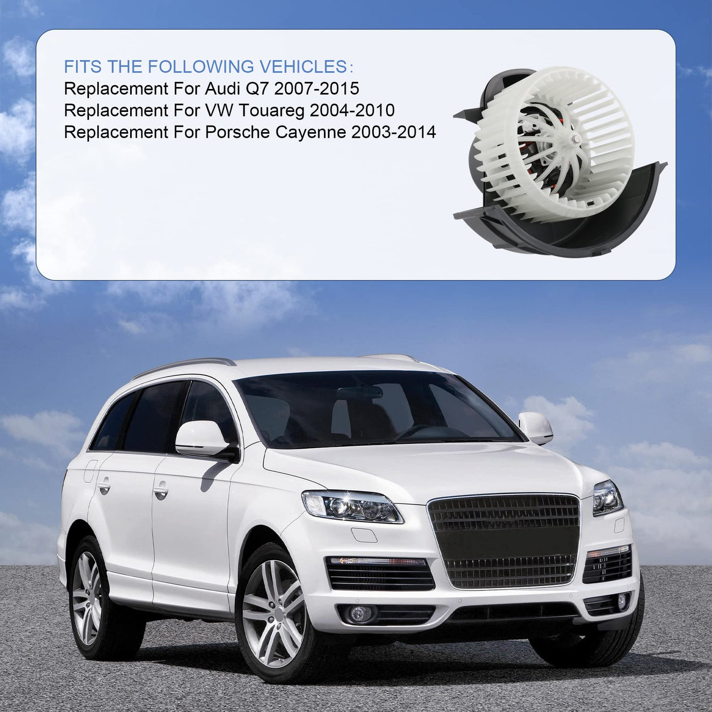 Detailed Applications Specifications: New, not remanufactured or rebuilt FRONT Blower Motor Includes blower motor fan cage impeller already installed Replaces dealer part numbers: 7L0-820-021-Q, 7L0-820-021-H, 7L0-820-021-L, 7L0820021Q, 7L0820021H, 7L0820021L Direct replacement Built to strict quality control standards 100% tested prior to leaving the factory Replacement For Audi Q7 2007-10 Front Heater Blower Motor with Fan Cage Replacement For VW Touareg 2004-10 Front Heater Blower Motor with Fan Cage