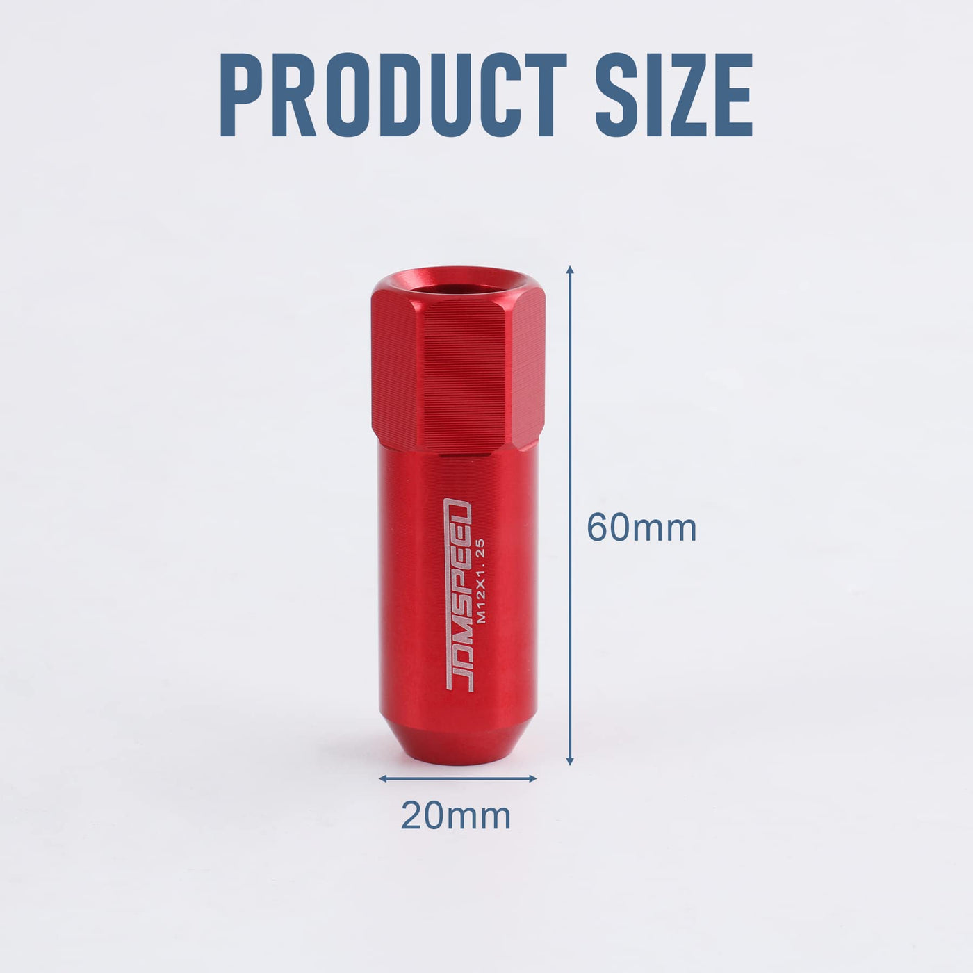 Q: What is the design and style of these lug nuts?A: The JDMSPEED Lug Nuts feature a slim design that eliminates the need for spline drive lug nuts. They have a 60-degree conical style seat, measuring 60mm in length and 20mm in width, making them ideal for aftermarket wheels.