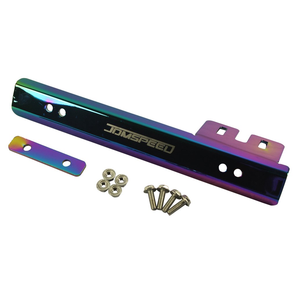 This is new Design License Plate Relocator According to JDM Style Item Specifications: Universal fit for most cars Neo Chrome color powder-coated anodized finish Made with 6061 T6-grade high quality solid billet aluminum Dimension: 11.75 x 2.25 x 1.50 Perfect for front bumper mounting license plate on the side Allow better airflow into the radiator/intercooler for better performance and fuel efficiency Keep your car 100% street legal and JDM! This complete set includes 1 piece aluminum license plate mounting bar 1 piece aluminum bumper mounting bar 4 pieces steel locking nuts with screws