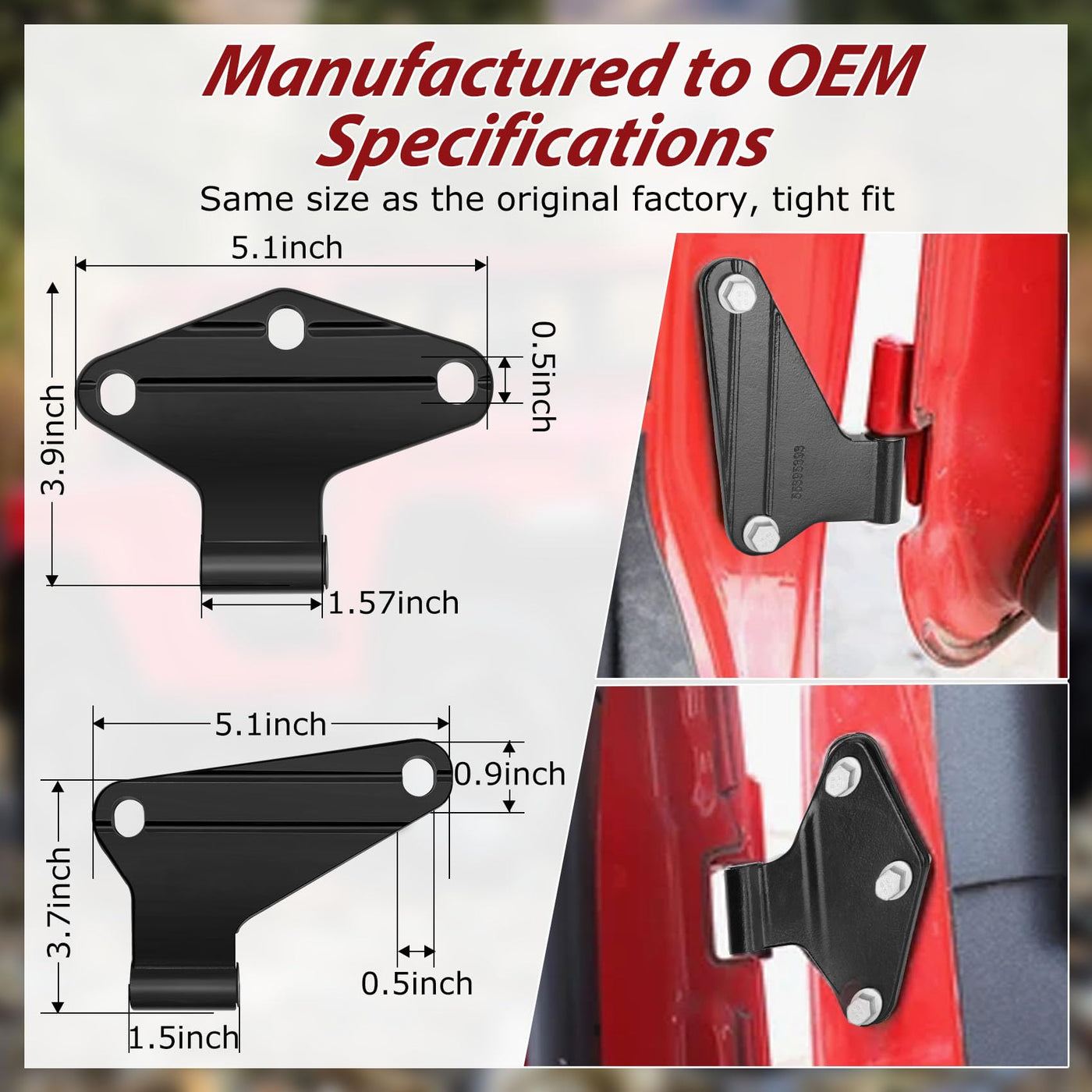 Jeep Wrangler Interior Door Hinge Size: 5.1 Inch x 1.57 Inch x 3.1 Inch. Jeep JK Interior Door Hinge Packaging Size: 13.9 Inch x 8.9 Inch x 7.4 Inch. Jeep JKU Inner Door Hinge packaging includes: Jeep Wrangler Inner 4 Door Hinges x 16, 16PCS with 36 Bolts,Specification x1. Jeep Unlimited Inside Door Hinge Material: Aluminum. Jeep Rubicon Inside Door Hinge surface treatment: 240 Hours of Electroplating. Jeep Sahara Outer Door Hinge features: Wide Compatibility, Easy Installation, Surface Electroplating, Anti-Rust, Anti-Oxidation and Waterproof. Jeep Wrangler JK Interior Door Hinge compatible cars and year models: Compatible with Jeep Wrangler JK JKU Unlimited Rubicon and Sahara 2007 2008 2009 2010 2011 2012 2013 2014 2015 2016 2017 2018 ( 2 Door models and 4 Door models) . Jeep Wrangler JK Interior Door Hinge Compatible with: Jeep Wrangler Inside Door Hinges Compatible with 2007 Jeep Wrangler JK JKU Rubicon Unlimited Sahara Jeep Wrangler Inside Door Hinges Compatible with 2008 Jeep Wrangler JK JKU Rubicon Unlimited Sahara Jeep Wrangler Inside Door Hinges Compatible with 2009 Jeep Wrangler JK JKU Rubicon Unlimited Sahara Jeep Wrangler Interior Door Hinges Compatible with 2010 Jeep Wrangler JK JKU Rubicon Unlimited Sahara Jeep Wrangler Interior Door Hinges Compatible with 2011 Jeep Wrangler JK JKU Rubicon Unlimited Sahara Jeep Wrangler Interior Door Hinges Compatible with 2012 Jeep Wrangler JK JKU Rubicon Unlimited Sahara Jeep Wrangler Inner Door Hinges Compatible with 2013 Jeep Wrangler JK JKU Rubicon Unlimited Sahara Jeep Wrangler Inner Door Hinges Compatible with 2014 Jeep Wrangler JK JKU Rubicon Unlimited Sahara Jeep Wrangler Inner Door Hinges Compatible with 2015 Jeep Wrangler JK JKU Rubicon Unlimited Sahara Jeep Wrangler Inner Door Hinges Compatible with 2016 Jeep Wrangler JK JKU Rubicon Unlimited Sahara Jeep Wrangler Interior Door Hinges Compatible with 2017 Jeep Wrangler JK JKU Rubicon Unlimited Sahara Jeep Wrangler Interior Door Hinges Compatible with 2018 Jeep Wrangler JK JKU Rubicon Unlimited Sahara