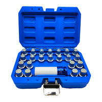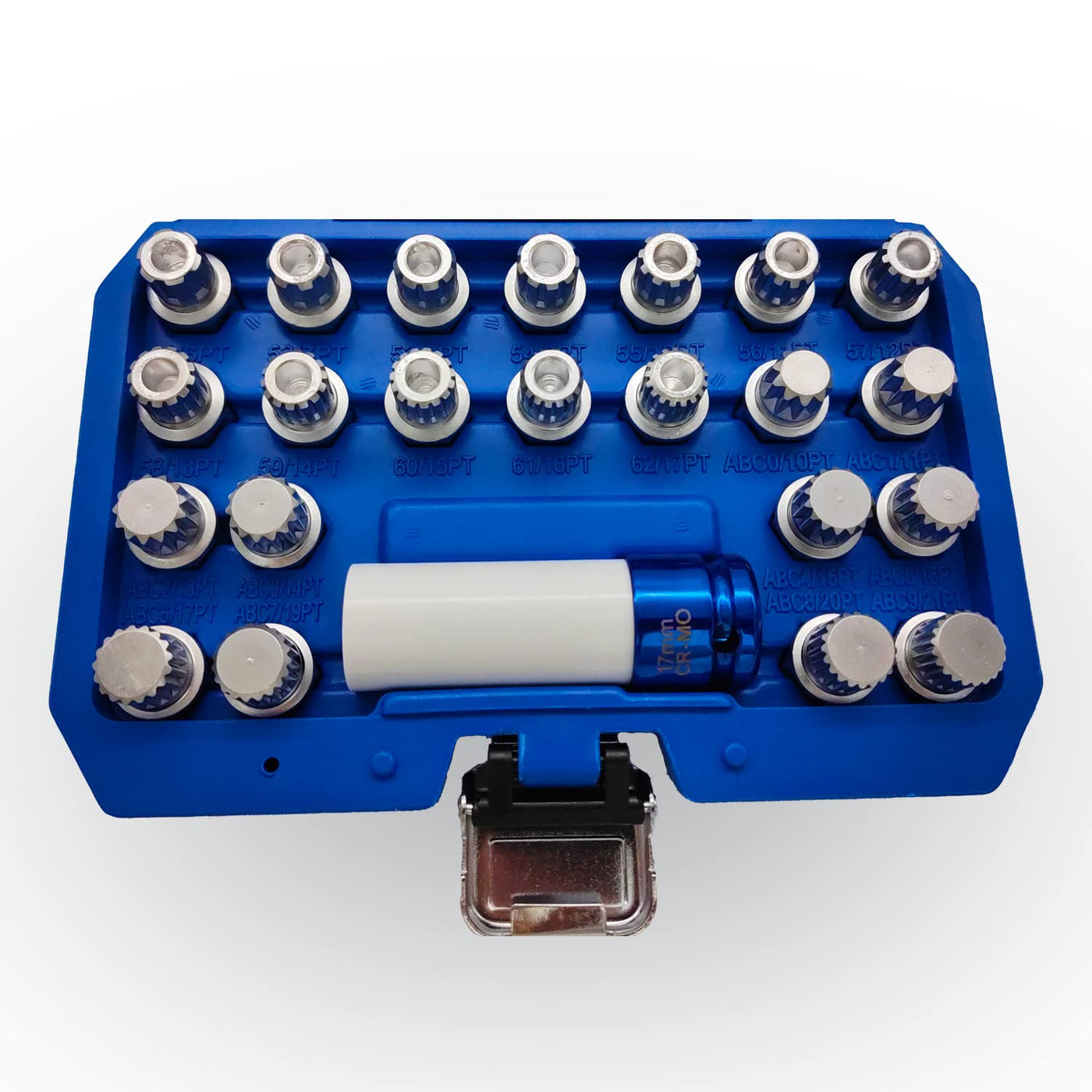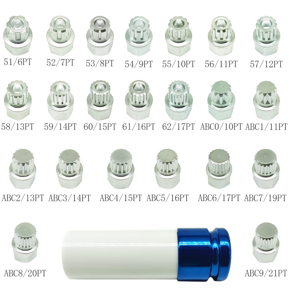Q: What types of sockets are included in the 23PCS Wheel Lock Nut Key Set?A: The kit includes a total of 22 different sockets designed for various VAG models. The sizes include #51/6PT, #52/7PT, #53/8PT, #54/9PT, #55/10PT, #56/11PT, #57/12PT, #58/13PT, 59/14PT, #60/15PT, #61/16PT, #62/17PT, and several others.