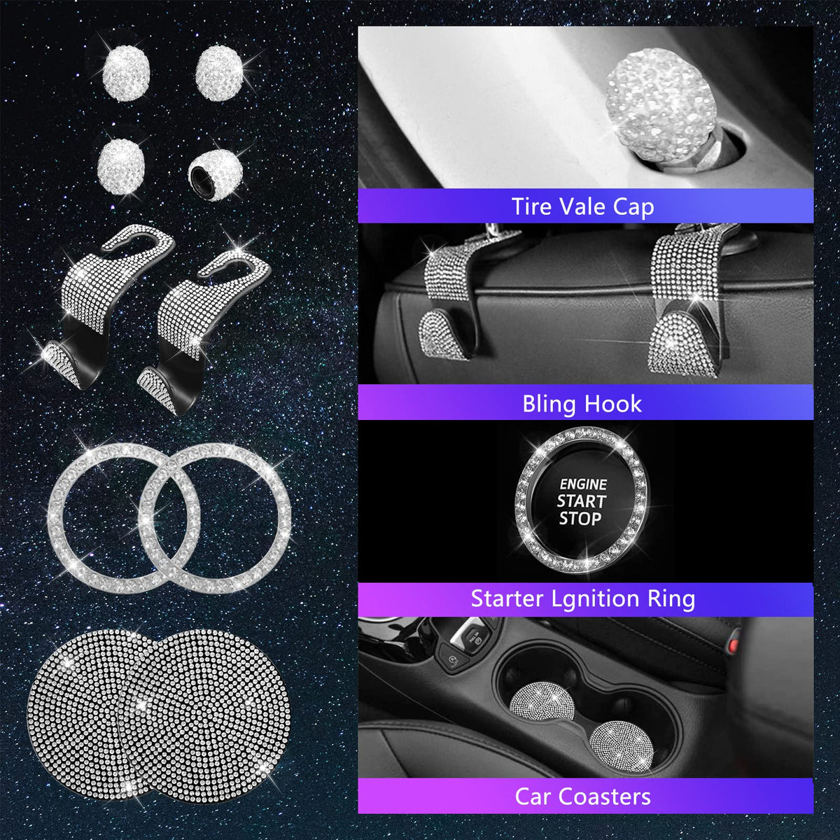 Function: The Steering Wheel Set Is Stylish And Eye-Catching With Rhinestones. With Different Car Logo Stickers Designed To Combine Car Interiors And Fashion Crafts.The Steering Wheel Has Excellent Texture Car Accessories Kits With Diamonds Will Improve The Interior Of Your Car, Make Your Car More Elegant And Gorgeous. Easy To Install: No Drilling Or Soldering Required, Easy Installation In Just 2 Minutes. Moreover,It Can Be Removed At Any Time,No Residue,No Marks On The Steering Wheel 1 Steering Wheel Cover 1 Bling Handbrake Cover 1 Bling Gear Change Set 2 Bling Safety Shoulder Straps 1 Bling Handrail Cushion 1 Bling Rearview Mirror Set 1 Bling Rearview Mirror Pendant 1 Bling License Plate Frame 1 Bling Tissue Box 1 Bling Sunglasses Clip 4 Bling Mini Hooks 2 Bling Coasters 2 Bling Startup Rings 2 Bling Back Hooks 4 Bling Car Air Nozzles