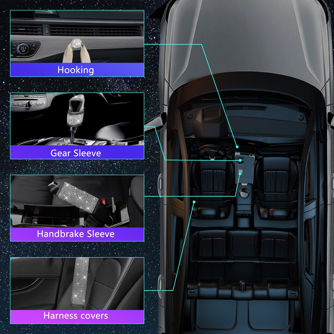 Q: What accessories are included in the JINGSEN Bling Car Parts Set?A: The set includes a bling steering wheel cover, bling handbrake cover, bling gear shift cover, safety shoulder straps, armrest cushion, rearview mirror cover, pendant, license plate holder, tissue box, sunglasses clip, mini hooks, coasters, starter rings, back hooks, and car air nozzles.