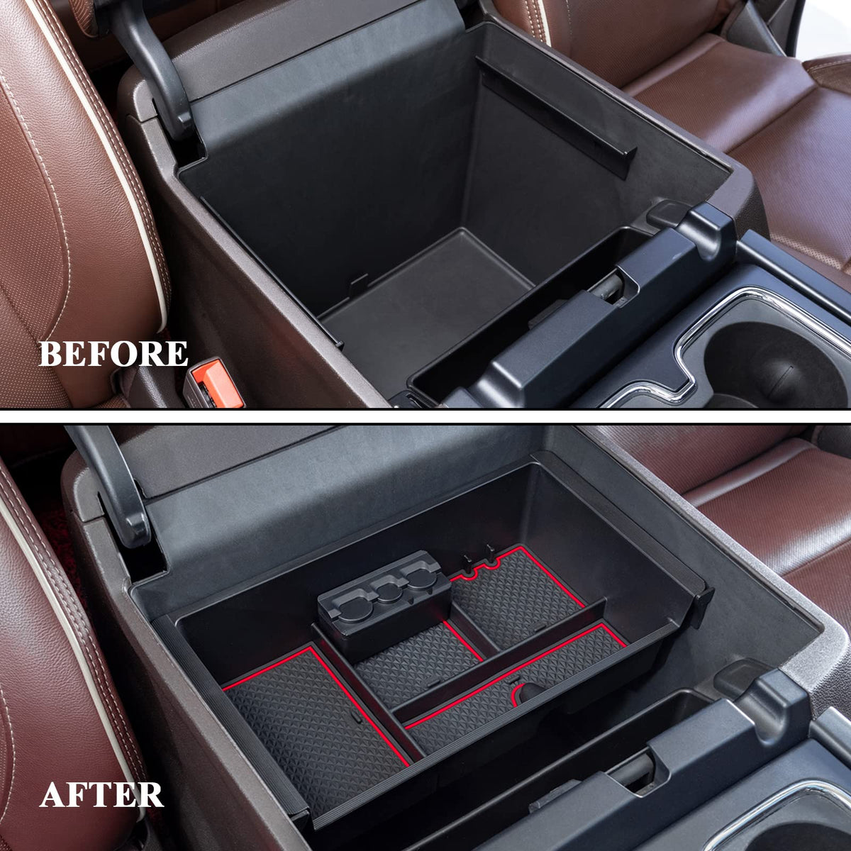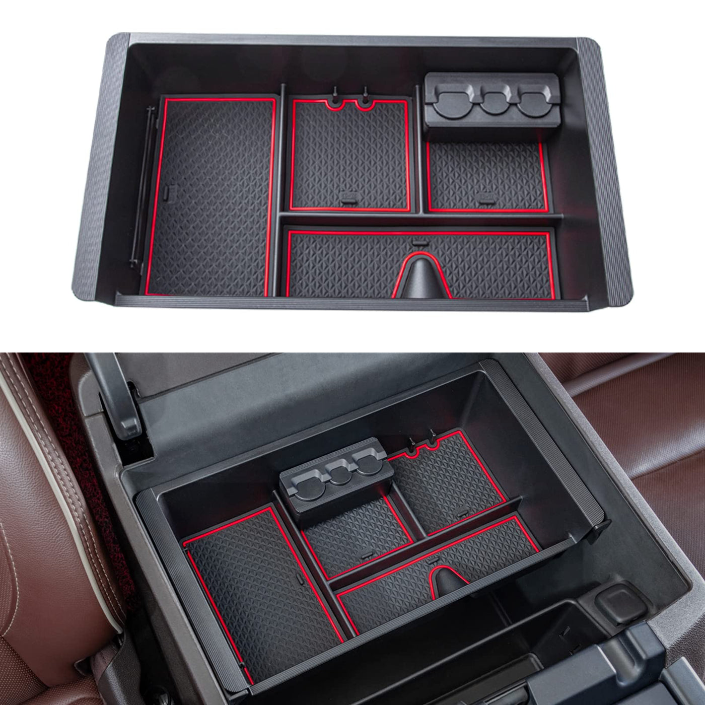 Q: How does the organizer prevent items from sliding around?A: The organizer includes three waterproof rubber pads that provide an anti-slip base, keeping your belongings in place and preventing them from sliding around in the console.