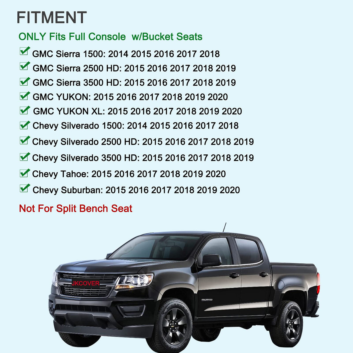 Q: Is the JKCOVER Center Console Organizer compatible with my Chevy Silverado or GMC Sierra?A: Yes, the JKCOVER Center Console Organizer is specifically designed to fit Chevy Silverado and GMC Sierra models from 2014 to 2018, as well as Chevy Tahoe, Suburban, and GMC Yukon models from 2015 to 2020 that have bucket seats.