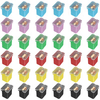 Q: How can I easily identify the different fuse ratings in this kit?A: Each fuse in the kit is color-coded according to its amperage rating, making it easy to identify. The fuses have distinct color plastic housings: blue for 20A, pink for 30A, green for 40A, red for 50A, yellow for 60A, and black for 80A. Additionally, the amp rating figures are carved on the top for quick reference.