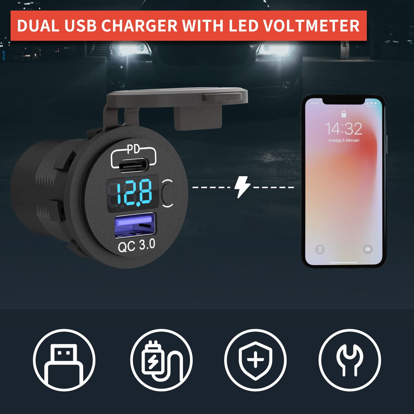 Q: Does the switch panel include any charging capabilities?A: Yes, the Joinfworld switch panel features a dual USB fast charger with PD3.0 and Quick Charge 3.0 ports, allowing for efficient charging of devices like smartphones while in use.