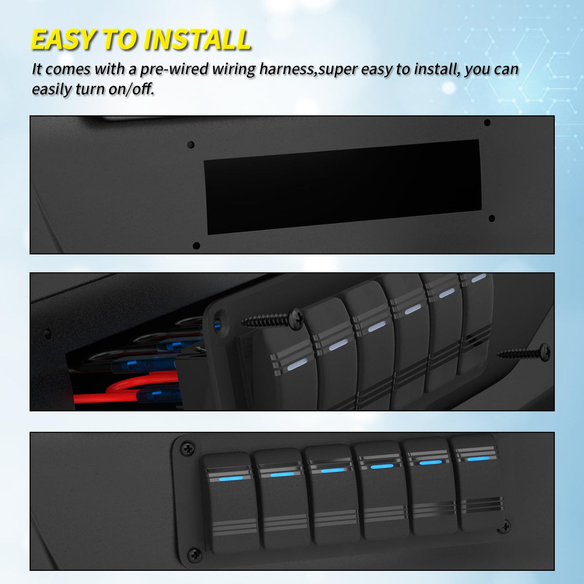 Q: Is the Joinfworld switch panel easy to install?A: Yes, the Joinfworld 6 Gang Rocker Switch Panel comes with a pre-wired design that simplifies installation. This feature allows for quick and hassle-free setup in various vehicles, including boats, cars, and RVs.