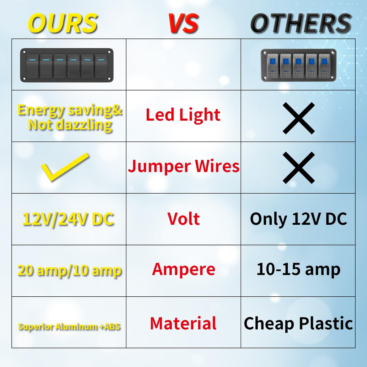 Single Led Light Switch Panel: The 6 Gang Rocker Switch Panel Features A Unique 1 Led Light Design, Compared With Other Dual Led Light Design, More Energy Saving And Much Less Dazzling