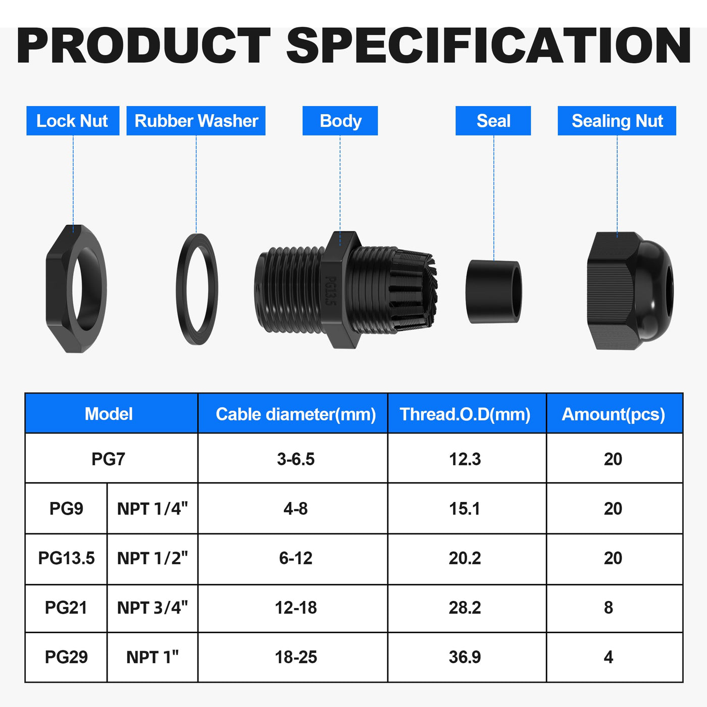 ★LONGER THREADS★ For these cable glands, we have designed 15mm(0.6") threads, which are longer and more convenient compared to others. More importantly, the cord grips are suitable for users to install on slightly thicker electrical boxes or other places. ★MULTIPLE SPECIFICATIONS★ There are five types of cord grips for users to apply in different scenarios. Totally 72 pieces, including 20pcs PG7(3-6.5mm), 20pcs NPT 1/4" PG9(4-8mm), 20pcs NPT 1/2" PG13.5(6-12mm), 8pcs NPT 3/4" PG21(12-18mm) and 4pcs NPT 1" PG29(18-25mm). ★IP68 WATERPROOF★ Each strain relief cord connectors comes with a washer that is made of superior rubber. The rubber washer can effectively prevent water, rain, UV, wind, and dust, ensuring the normal operation of electrical equipment. ★NYLON MATERIAL★ These waterproof cable glands are made from upgraded plastic material nylon PA66, which features corrosion resistance and high tensile strength. And they will not decay or crack even if used in bad weather for a long time. ★WIDE APPLICATION★ The waterproof cable pass through holds a wide range of applications, fits well for cable fixing, transformer connection, elecrical boxes, light controllers and etc. Providing long-term protection for your indoor and outdoor electrical appliances.