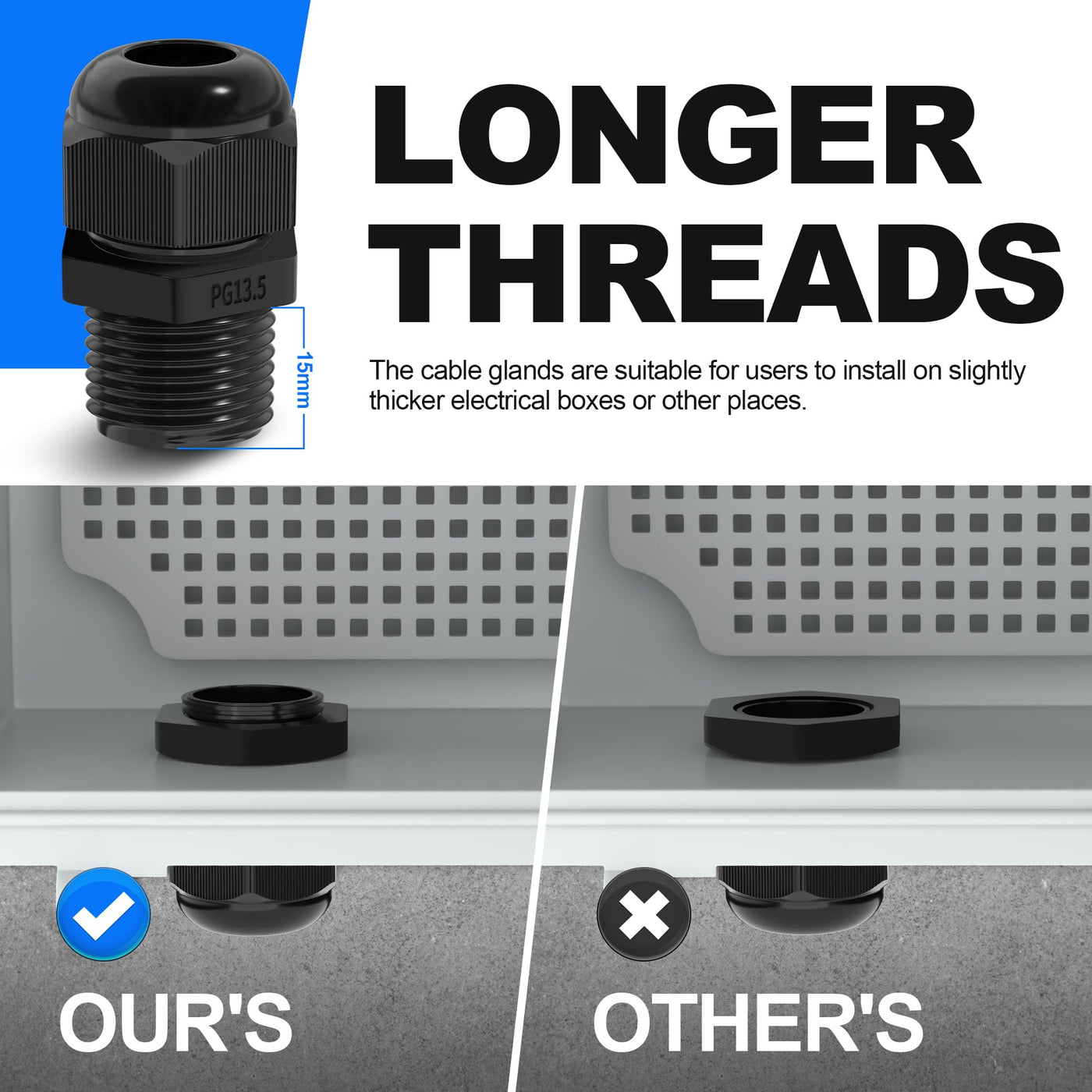 Q: Can these cable glands be used with thicker electrical boxes?A: Yes, the cable glands feature longer threads measuring 15mm (0.6"), which makes them suitable for installation on thicker electrical boxes and various other applications.