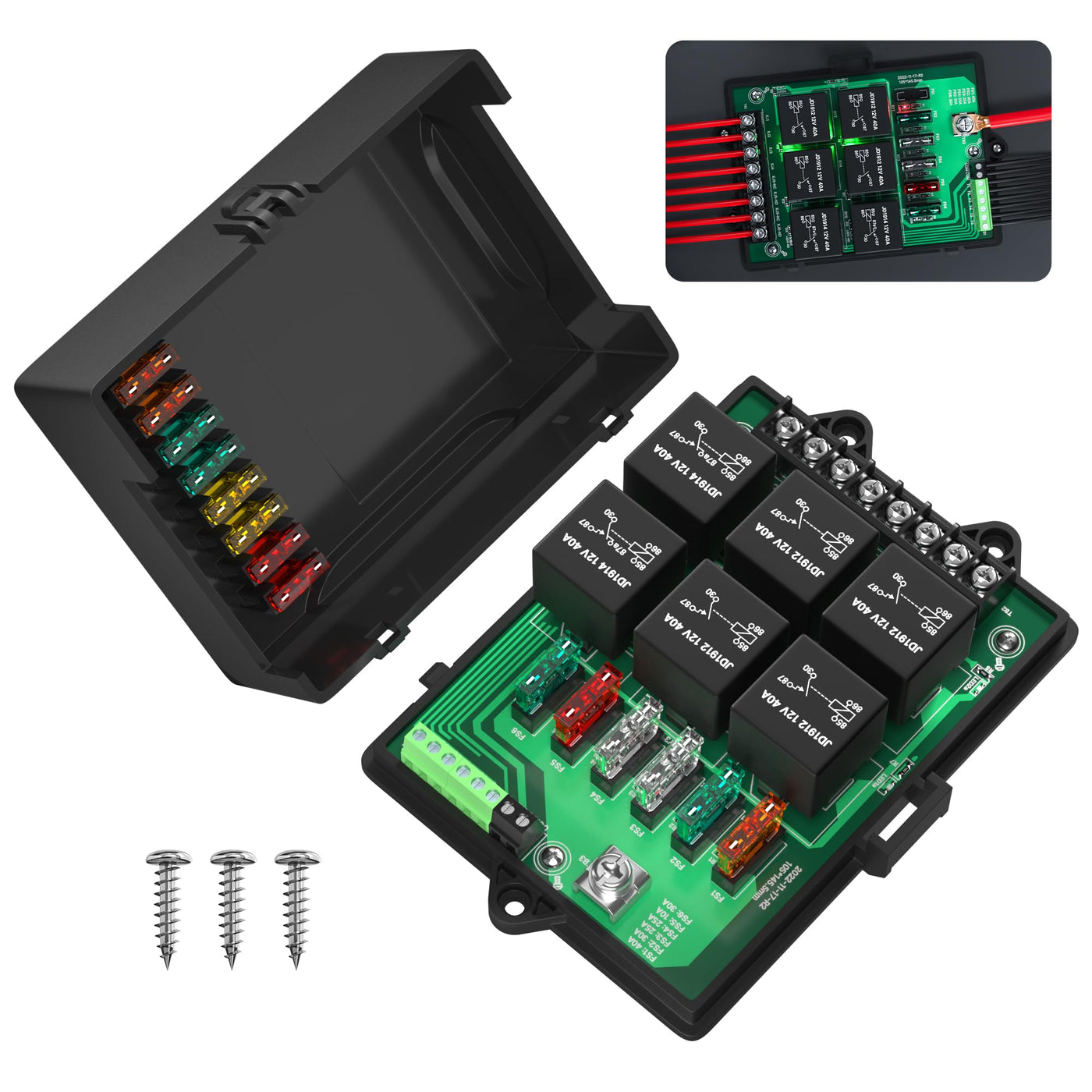 Assembled Relay Box: The automotive 12V Relay Fuse Box has high capacity, this relay holder box package includes 2pcs 5pin 40A relays and 4pcs 4pin 40A relays, total 14pcs 10A, 15A, 20A, 25A, 30A, 40A blade fuses. They are all neatly installed in this box; Ease of Installation: Our unique and upgraded fuse relay box comes with relay module, all the accessories are assembled on this relay panel, so you don't need to weld the wires. This design of our relay panel box also makes your installation more flexible and convenient; LED indicator light: The relay box 12v is equipped with LED indicator light for each relay and blade fuse to allow you to know their working states, design with overvoltage protection and surge protection safety protection, to make your work more safe and reliable; Waterproof: Joinfworld 12v relay fuse box is made of high-quality nylon material flame retardant shell, and the cover designed with a buckle which makes it have a better waterproof effect; Wide Application: The 12v relay box can make your wiring more neat and more convenient, and it is suitable for all vehicles, 4X4 Offroad SUV UTV ATV RV Pickup Truck Trailer Camper Marine Boat, etc.