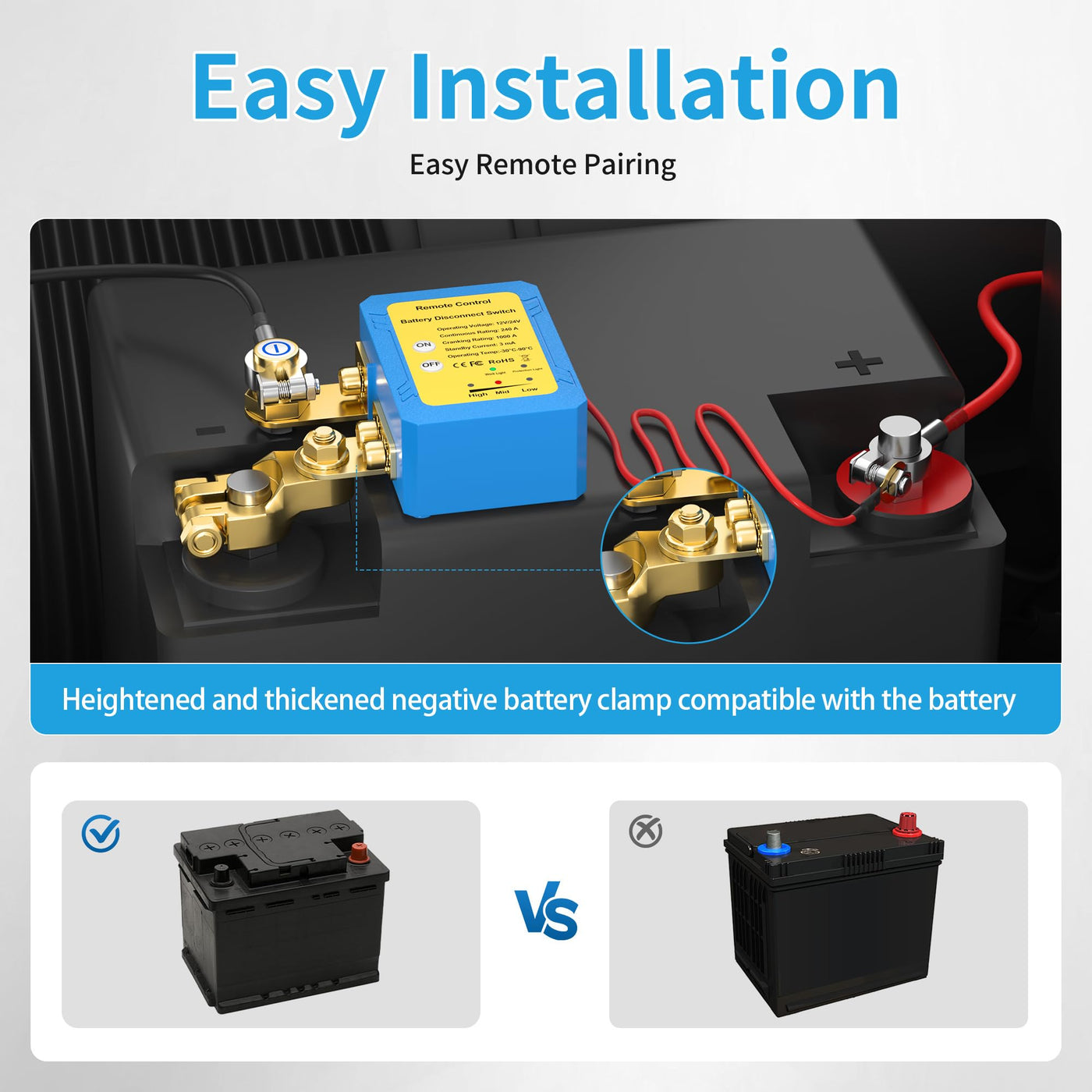 Q: Is this battery disconnect switch compatible with all types of vehicles?A: Yes, this 12V remote battery disconnect switch is designed to be compatible with most car types, including cars, trucks, RVs, and boats.