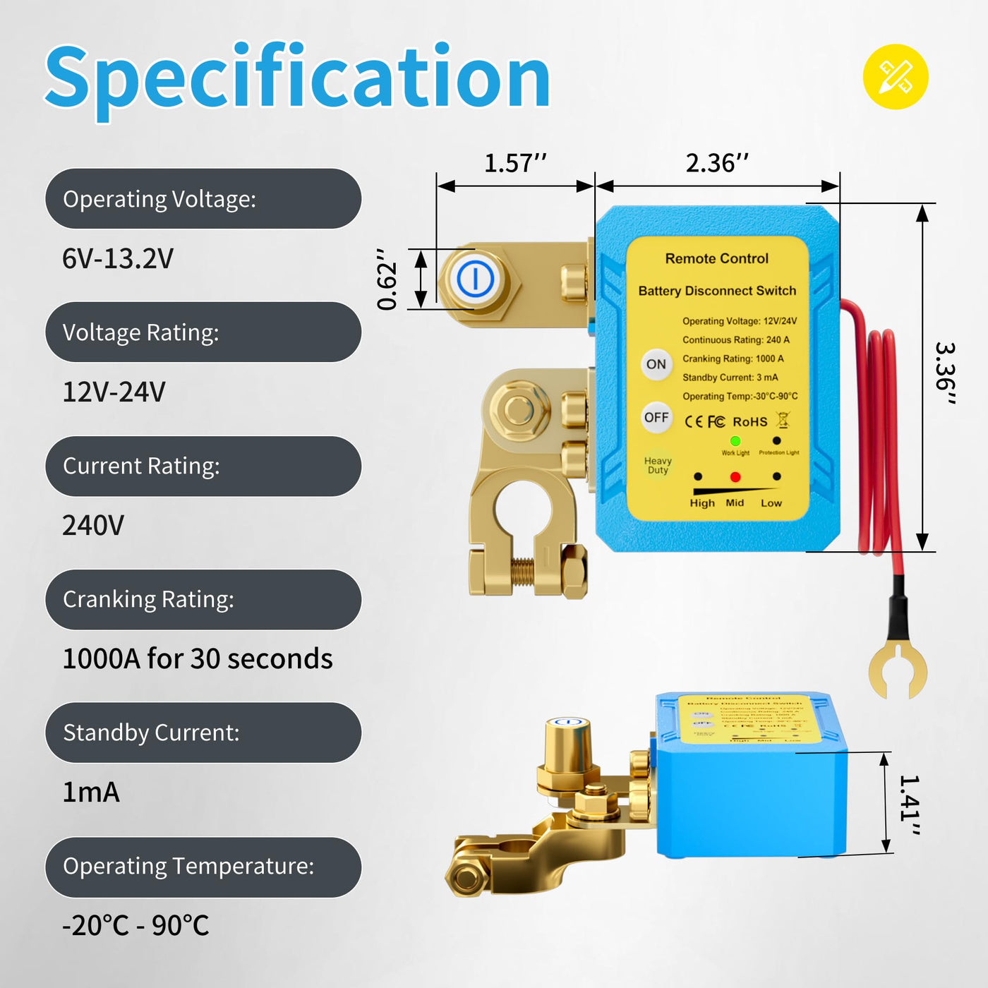 Product Specification: Rating: Rated Voltage: 12V-24V; Rated Current: 240A; Standby Current: 1Ma; Power-Off Threshold: 11.8V0.2V; Cranking Rating: 1000A For 30 Seconds; Instantaneous Current: 500A. Heavy Duty Design 12V Remote Control Switch, Effectively Enhances The Reliability When Use. Joinfworld 240A Remote Battery Disconnect Switch Will Come With All Necessary Accessories For Convenient Use; Top Installation: Our 12V Remote Battery Disconnect Switch Features Heightened And Thickened Negative Battery Clamp Which Can Be Compatible With Top Mounted Batteries, It Makes Your Installation More Convenient. This Kill Switch For Car 12V 240A Adopts The Negative Connection Method, It Protect The Safety Of The Circuit Environment And Suitable For Most Car Types Of Circuit Installation. You Simply Press The Remote Control Button To Disconnect Your Car Power System, Which Saves You A Lot Of Time. Please Turn Off The Power Before Installation! Super Low Power Consumption: This 240V Remote Battery Disconnect Switch 12V With Magnetic Holding Relay Which Is A New Type Of Relay That Uses Magnetic Principle To Control Circuit Opening And Cutting, And The Stand-By Current Is 1Ma, So It Is More Energy Saving; Low Voltage Protection: When The Voltage Is Lower Than 11.8V, The Remote Control Function Will Fail, And The Device Will Automatically Cut Off After 120S; When The Voltage Is Higher Than 13.3V, The Remote Control Function Will Fail, You Must Use Manual Switch To Cut Off The Power; Anti-Theft: Our Car Battery Kill Switch Comes With Two Paired Wireless Remote Fobs, The Remote Control Can Be Controlled Within 100 Meters, It Will Not Only Prevent The Battery From Being Draining, But Also Reduces The Risk Of Theft Occurs. This 12V Remote Battery Disconnect Switch Is Suitable For Car, Truck, Boat, Rv, Travel Trailer.